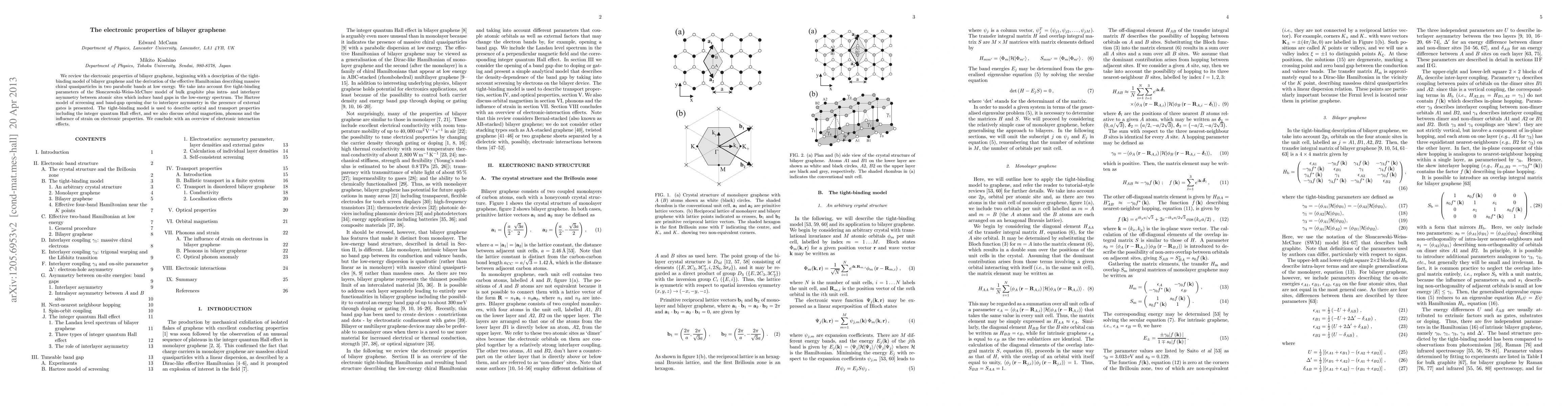 We review the electronic properties of bilayer graphene, beginning with a description of the tight-binding model of bilayer graphene and the derivation of the effective Hamiltonian describing massive chiral quasiparticles in two parabolic bands at low energy. We take into account five tight-binding parameters of the Slonczewski-Weiss-McClure model of bulk graphite plus intra- and interlayer asymmetry between atomic sites which induce band gaps in the low-energy spectrum. The Hartree model of screening and band-gap opening due to interlayer asymmetry in the presence of external gates is presented. The tight-binding model is used to describe optical and transport properties including the integer quantum Hall effect, and we also discuss orbital magnetism, phonons and the influence of strain on electronic properties. We conclude with an overview of electronic interaction effects.