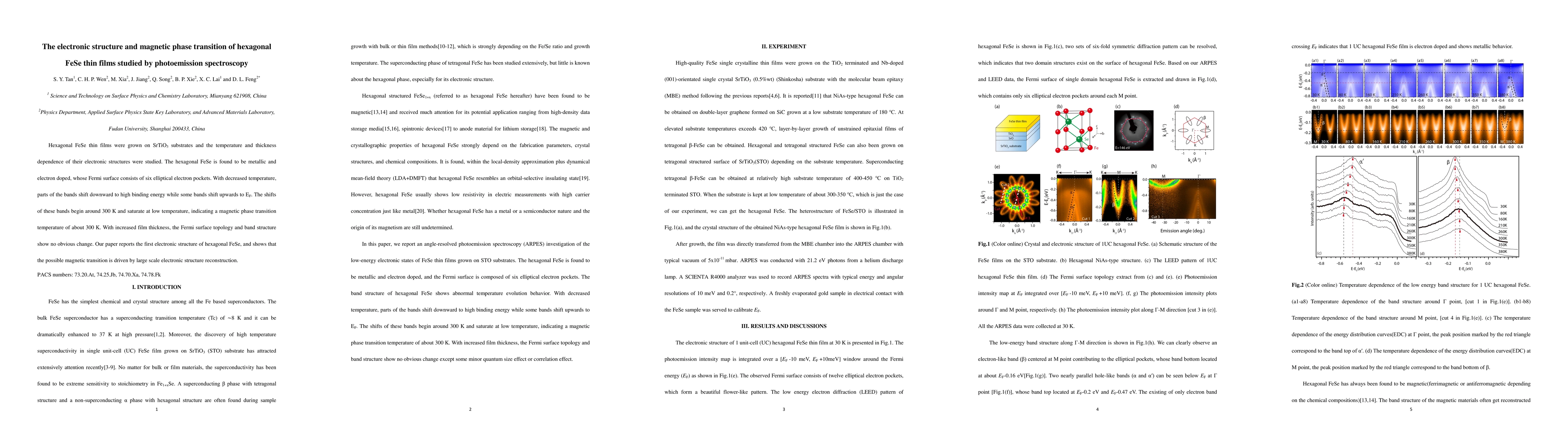 This study investigates the electronic structure and magnetic phase transition in hexagonal FeSe thin films using photoemission spectroscopy. The films exhibit metallic and electron-doped characteristics, with a Fermi surface of six elliptical electron pockets. A magnetic phase transition occurs around 300 K, driven by large-scale electronic structure changes.