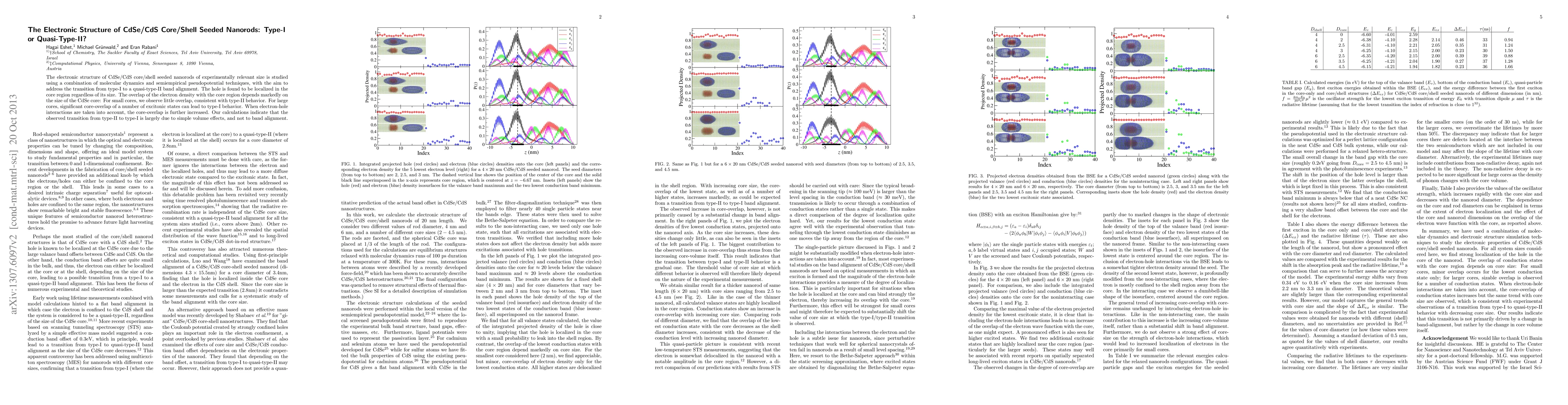 The electronic structure of CdSe/CdS core/shell seeded nanorods of experimentally relevant size is studied using a combination of molecular dynamics and semiempirical pseudopotential techniques, with the aim to address the transition from type-I to a quasi-type-II band alignment. The hole is found to be localized in the core region regardless of its size. The overlap of the electron density with the core region depends markedly on the size of the CdSe core: For small cores, we observe little overlap, consistent with type-II behavior. For large cores, significant core-overlap of a number of excitonic states can lead to type-I behavior. When electron-hole interactions are taken into account, the core-overlap is further increased. Our calculations indicate that the observed transition from type-II to type-I is largely due to simple volume effects, and not to band alignment.
