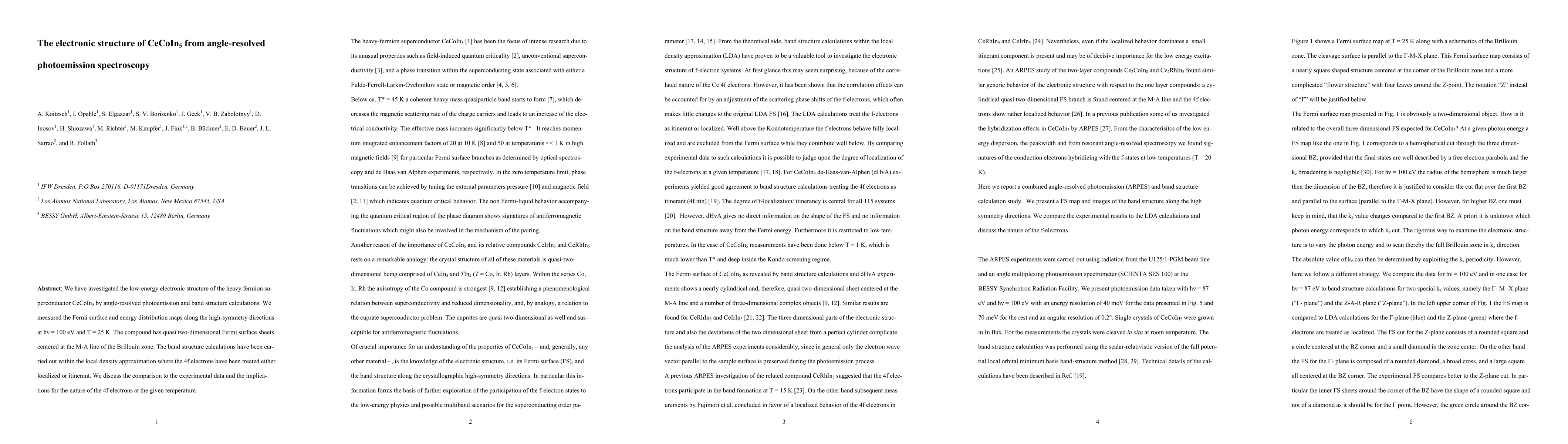 Researchers used angle-resolved photoemission to study CeCoIn5, finding a quasi-2D Fermi surface centered at the M-A line of the Brillouin zone, with implications for the nature of its 4f electrons.