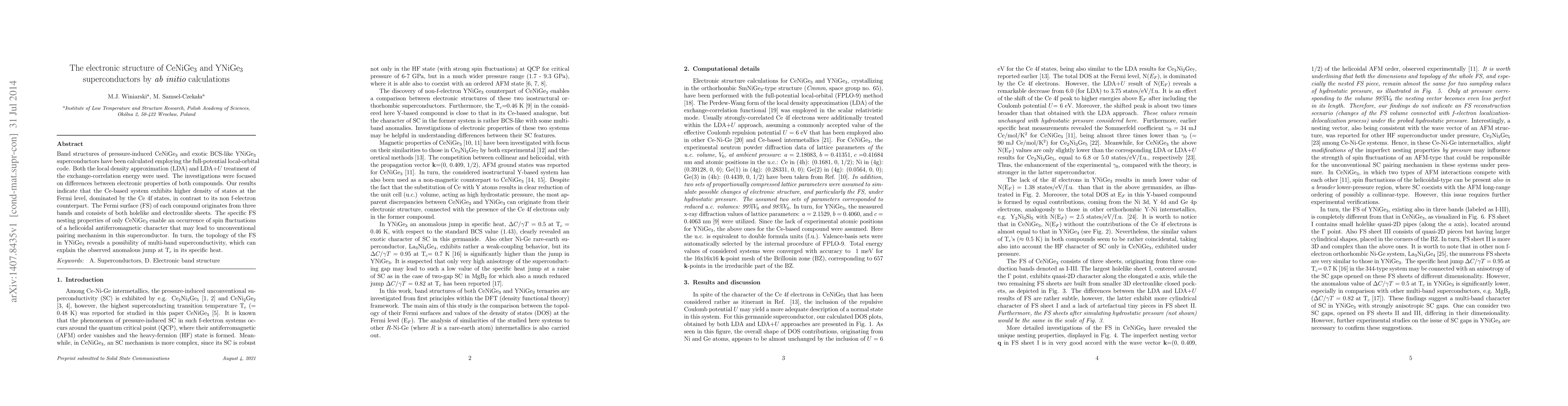 Band structures of pressure-induced CeNiGe3 and exotic BCS-like YNiGe3 superconductors have been calculated employing the full-potential local-orbital code. Both the local density approximation (LDA) and LDA+U treatment of the exchange-correlation energy were used. The investigations were focused on differences between electronic properties of both compounds. Our results indicate that the Ce-based system exhibits higher density of states at the Fermi level, dominated by the Ce 4f states, in contrast to its non f-electron counterpart. The Fermi surface (FS) of each compound originates from three bands and consists of both holelike and electronlike sheets. The specific FS nesting properties of only CeNiGe3 enable an occurrence of spin fluctuations of a helicoidal antiferromagnetic character that may lead to unconventional pairing mechanism in this superconductor. In turn, the topology of the FS in YNiGe3 reveals a possibility of multi-band superconductivity, which can explain the observed anomalous jump at Tc in its specific heat.