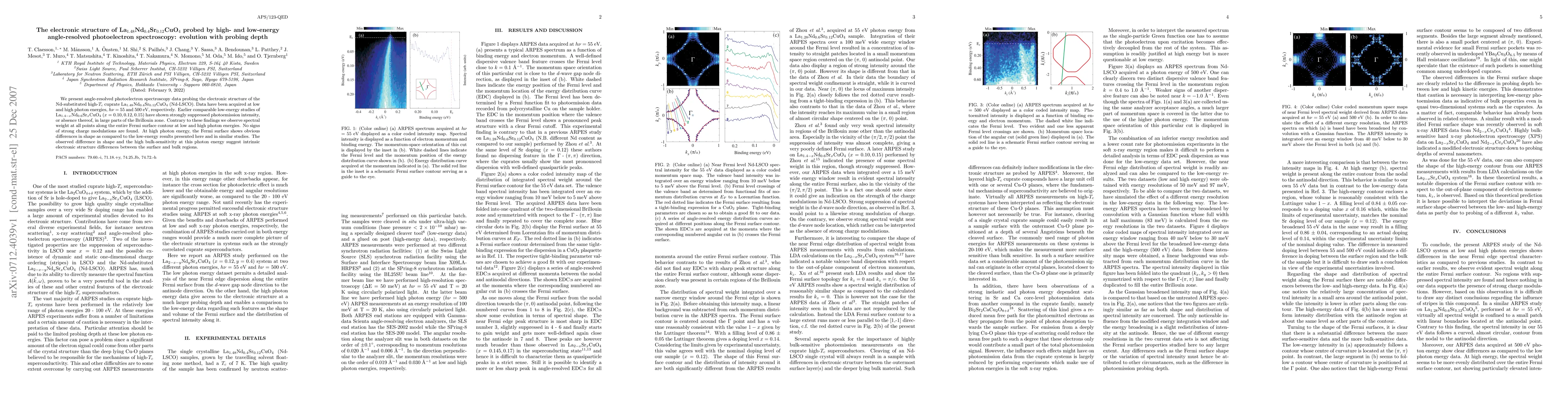 This paper reports angle-resolved photoelectron spectroscopy data on Nd-substituted high-$T_c$ cuprate Nd-LSCO, revealing spectral weight across the Fermi surface at both low and high photon energies, contrasting previous studies. High-energy data suggest intrinsic electronic structure differences between surface and bulk regions.