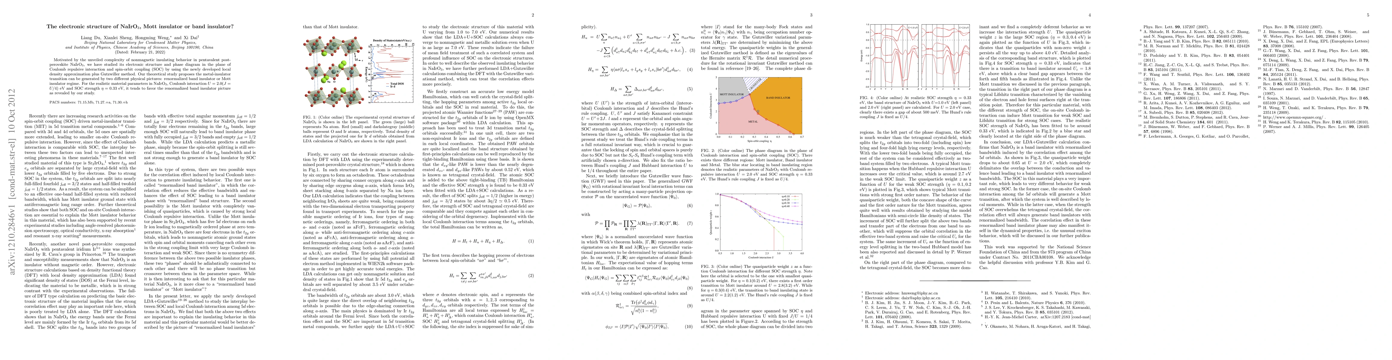 The study of NaIrO$_3$'s electronic structure suggests it may exhibit a metal-insulator transition through either a renormalized band insulator or Mott insulator regime, with current parameters favoring the band insulator picture. The analysis uses the local density approximation plus Gutzwiller method.
