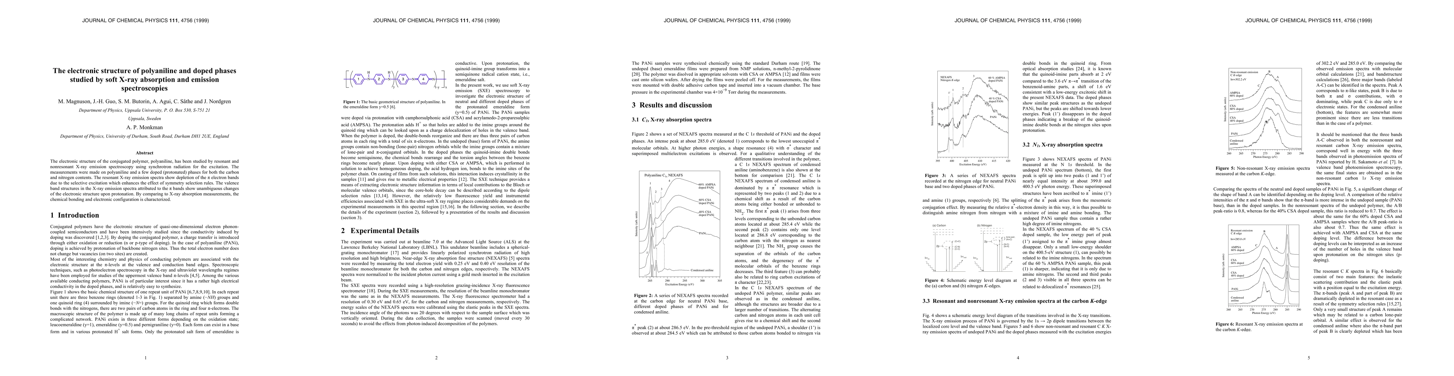 This paper investigates the electronic structure of polyaniline and its doped phases using soft X-ray absorption and emission spectroscopies, revealing changes in the π bands and electronic configuration upon protonation through resonant X-ray emission spectra. The study highlights the effect of symmetry selection rules on π electron bands.