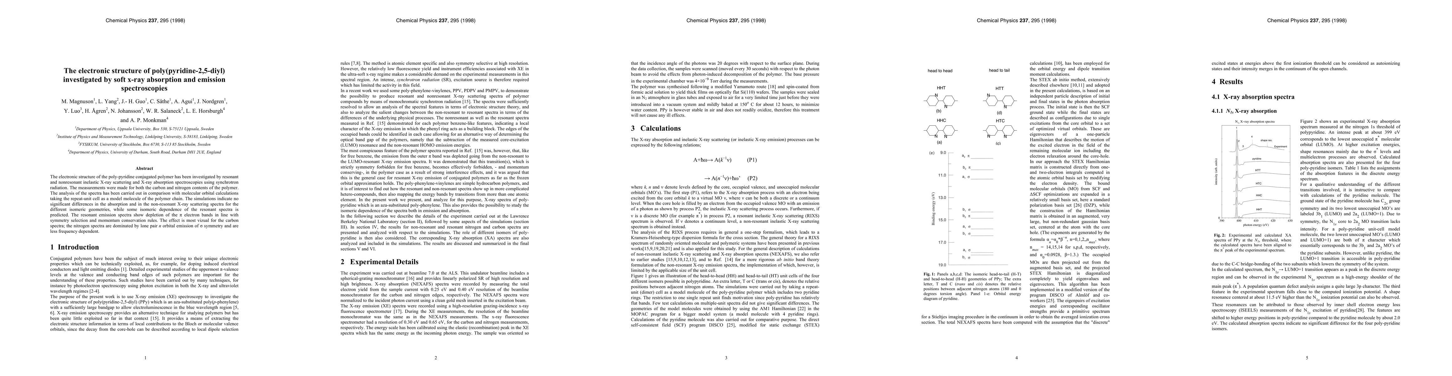 This research investigates the electronic structure of poly(pyridine-2,5-diyl) using soft x-ray absorption and emission spectroscopies, revealing no significant differences in non-resonant spectra across isomeric geometries, while resonant spectra show isomeric dependence. The carbon spectra indicate π electron band depletion, whereas nitrogen spectra are dominated by σ symmetry lone pair orbitals.