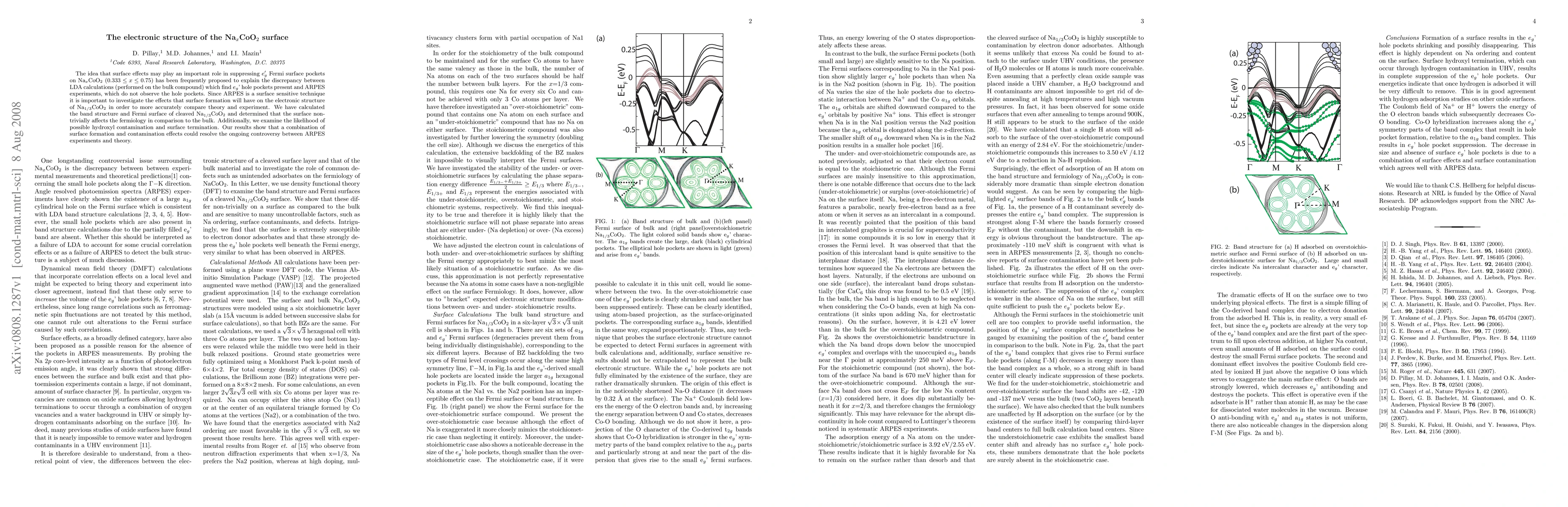 Researchers found that surface effects in Na$_x$CoO$_2$ affect its electronic structure, resolving a discrepancy between theory and experiment. Surface formation and contamination may have contributed to the observed hole pockets not being detected by ARPES experiments.
