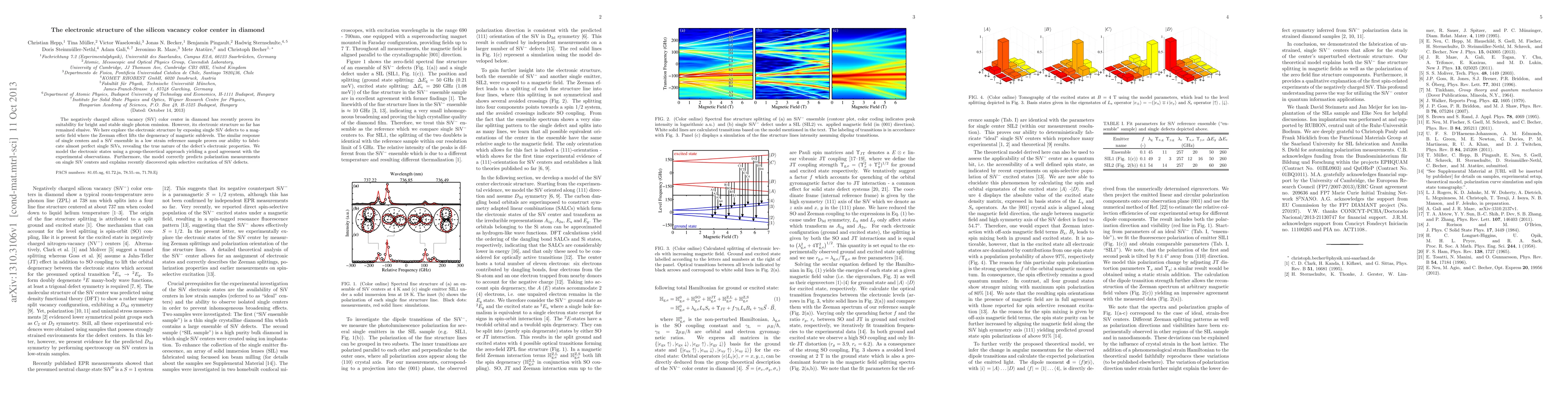 The research investigates the electronic structure of negatively charged silicon vacancy (SiV) color centers in diamond, revealing their bright and stable single photon emission. By employing a magnetic field and group-theoretical modeling, the study uncovers the true nature of the defect's electronic properties and predicts polarization behaviors, explaining spin selective excitation.