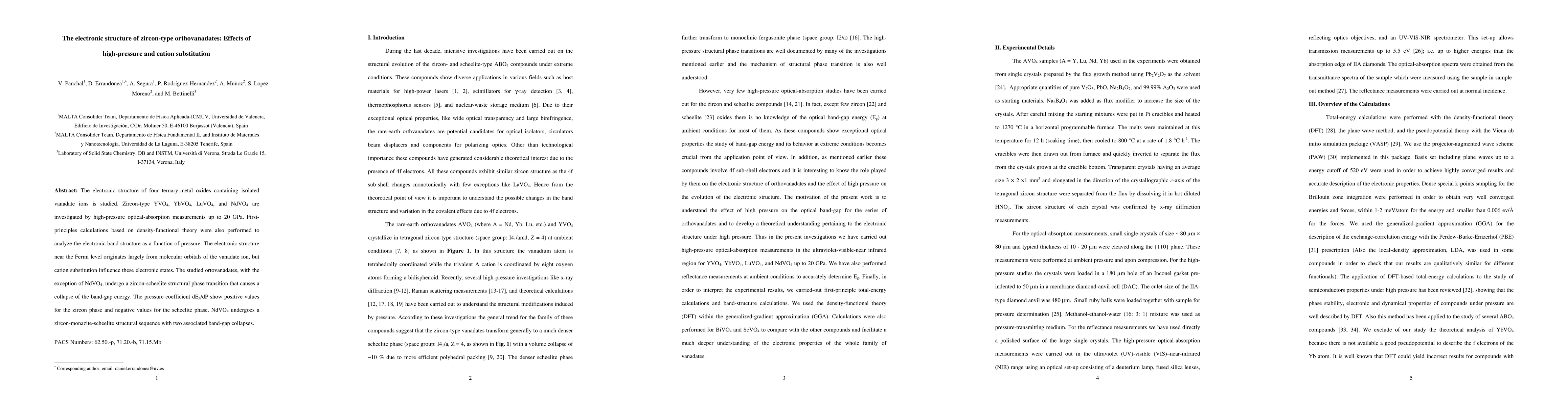This paper investigates the electronic structure of zircon-type orthovanadates under high pressure and with cation substitution, revealing that the band-gap energy collapses due to structural phase transitions, with NdVO4 showing a unique sequence of transitions. First-principles calculations show that cation substitution influences the electronic states, primarily derived from the vanadate ions.