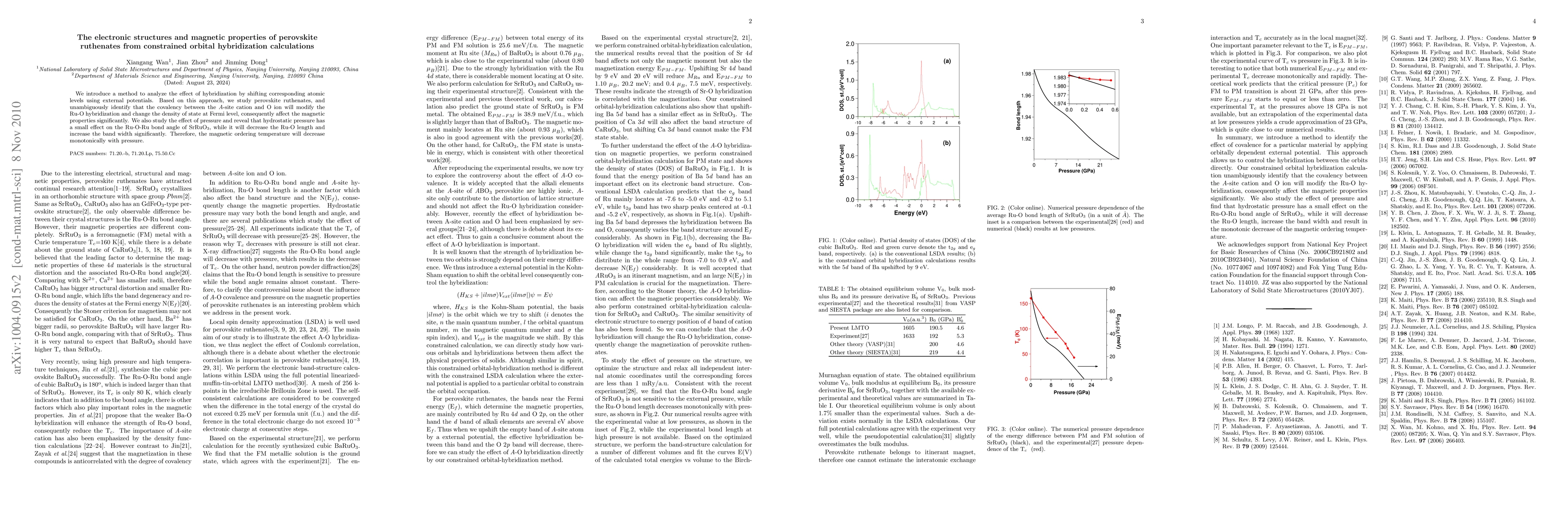 This paper introduces a method to analyze the electronic structure of perovskite ruthenates by shifting atomic levels with external potentials, revealing that covalency between the A-site cation and oxygen modifies Ru-O hybridization and affects magnetic properties. It also finds that pressure decreases the magnetic ordering temperature by altering the Ru-O bond length and increasing bandwidth.