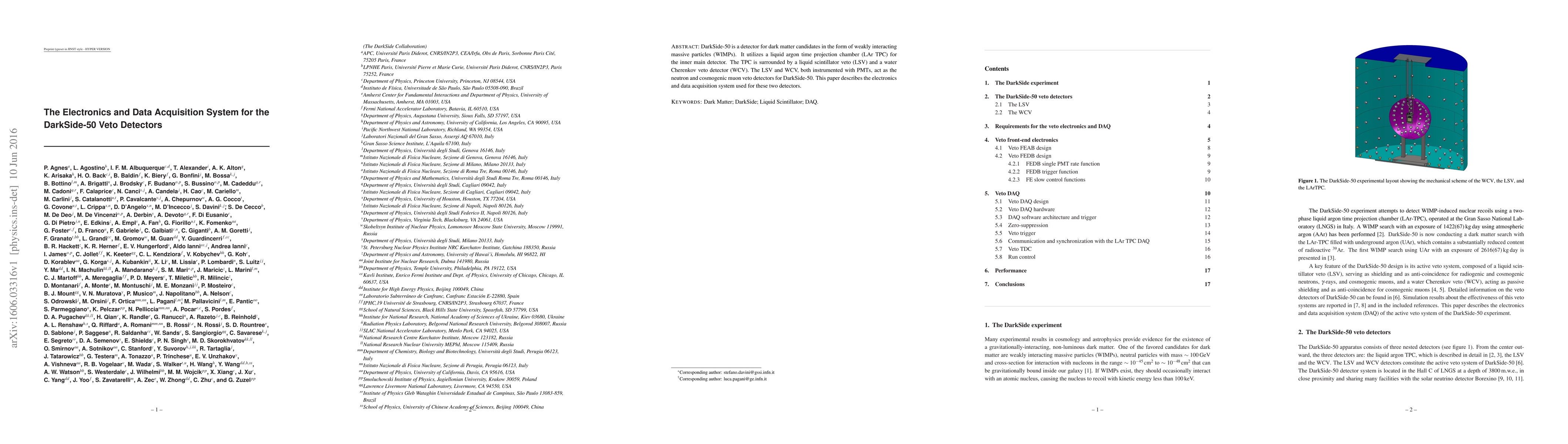 This paper details the electronics and data acquisition system for the liquid scintillator veto (LSV) and water Cherenkov veto detector (WCV) used in the DarkSide-50 experiment to detect dark matter candidates, enhancing the main liquid argon time projection chamber (LAr TPC) with neutron and muon veto capabilities.