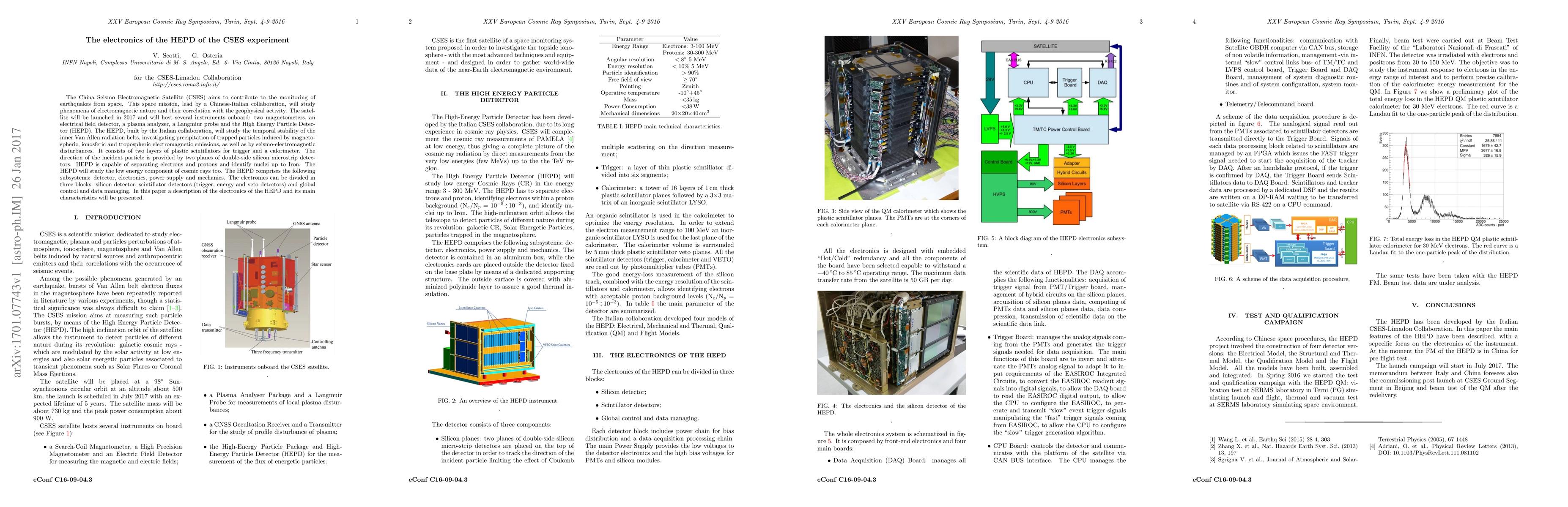 The China Seismo Electromagnetic Satellite (CSES) aims to contribute to the monitoring of earthquakes from space. This space mission, lead by a Chinese-Italian collaboration, will study phenomena of electromagnetic nature and their correlation with the geophysical activity. The satellite will be launched in 2017 and will host several instruments onboard: two magnetometers, an electrical field detector, a plasma analyzer, a Langmiur probe and the High Energy Particle Detector (HEPD). The HEPD, built by the Italian collaboration, will study the temporal stability of the inner Van Allen radiation belts, investigating precipitation of trapped particles induced by magnetospheric, ionosferic and tropospheric electromagnetic emissions, as well as by seismo-electromagnetic disturbances. It consists of two layers of plastic scintillators for trigger and a calorimeter. The direction of the incident particle is provided by two planes of double-side silicon microstrip detectors. HEPD is capable of separating electrons and protons and identify nuclei up to Iron. The HEPD will study the low energy component of cosmic rays too. The HEPD comprises the following subsystems: detector, electronics, power supply and mechanics. The electronics can be divided in three blocks: silicon detector, scintillator detectors (trigger, energy and veto detectors) and global control and data managing. In this paper a description of the electronics of the HEPD and its main characteristics will be presented.