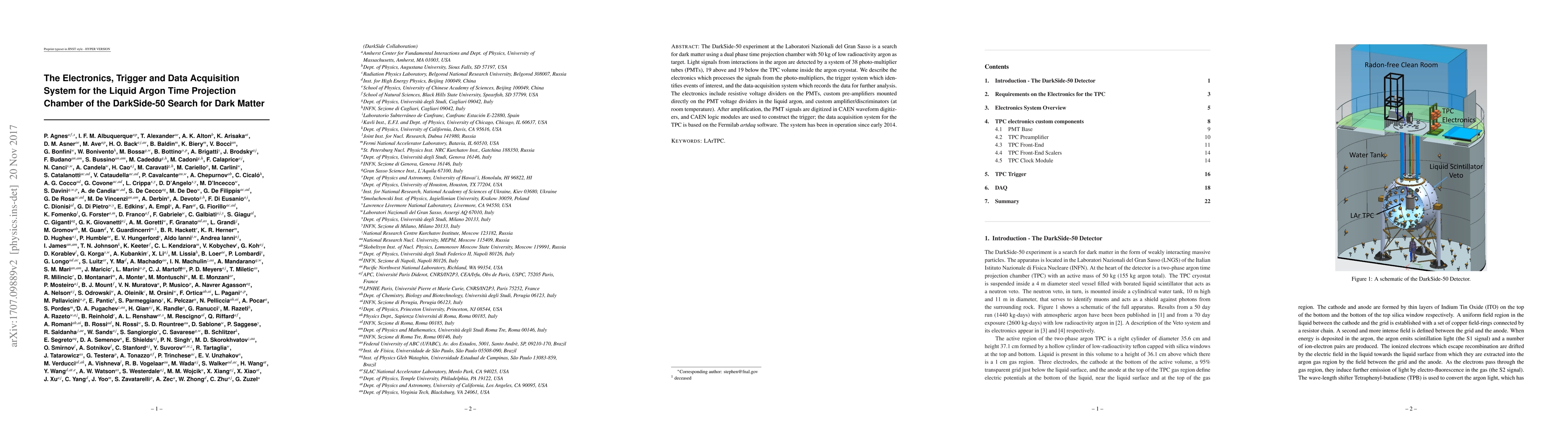 The paper details the electronics, trigger, and data acquisition system for the DarkSide-50 dark matter experiment using a dual-phase argon time projection chamber. The system, operational since 2014, uses 38 PMTs, custom pre-amplifiers, and CAEN waveform digitizers and logic modules, with data acquisition managed by the Fermilab 'artdaq' software.
