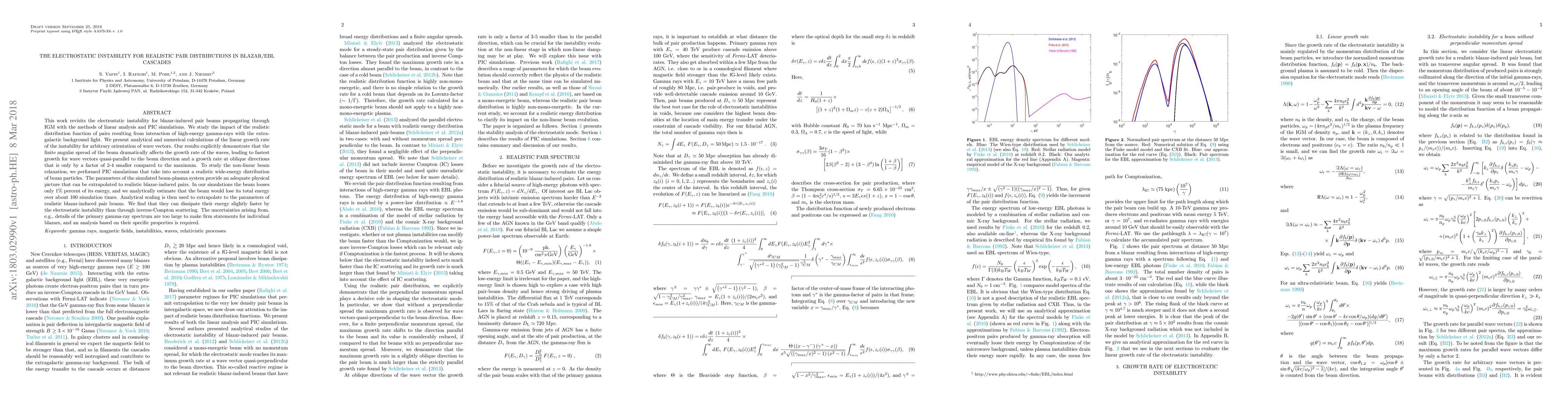 This work revisits the electrostatic instability for blazar-induced pair beams propagating through IGM with the methods of linear analysis and PIC simulations. We study the impact of the realistic distribution function of pairs resulting from interaction of high-energy gamma-rays with the extragalactic background light. We present analytical and numerical calculations of the linear growth rate of the instability for arbitrary orientation of wave vectors. Our results explicitly demonstrate that the finite angular spread of the beam dramatically affects the growth rate of the waves, leading to fastest growth for wave vectors quasi-parallel to the beam direction and a growth rate at oblique directions that is only by a factor of 2-4 smaller compared to the maximum. To study the non-linear beam relaxation, we performed PIC simulations that take into account a realistic wide-energy distribution of beam particles. The parameters of the simulated beam-plasma system provide an adequate physical picture that can be extrapolated to realistic blazar-induced pairs. In our simulations the beam looses only 1\% percent of its energy, and we analytically estimate that the beam would lose its total energy over about $100$ simulation times. Analytical scaling is then used to extrapolate to the parameters of realistic blazar-induced pair beams. We find that they can dissipate their energy slightly faster by the electrostatic instability than through inverse-Compton scattering. The uncertainties arising from, e.g., details of the primary gamma-ray spectrum are too large to make firm statements for individual blazars, and an analysis based on their specific properties is required.