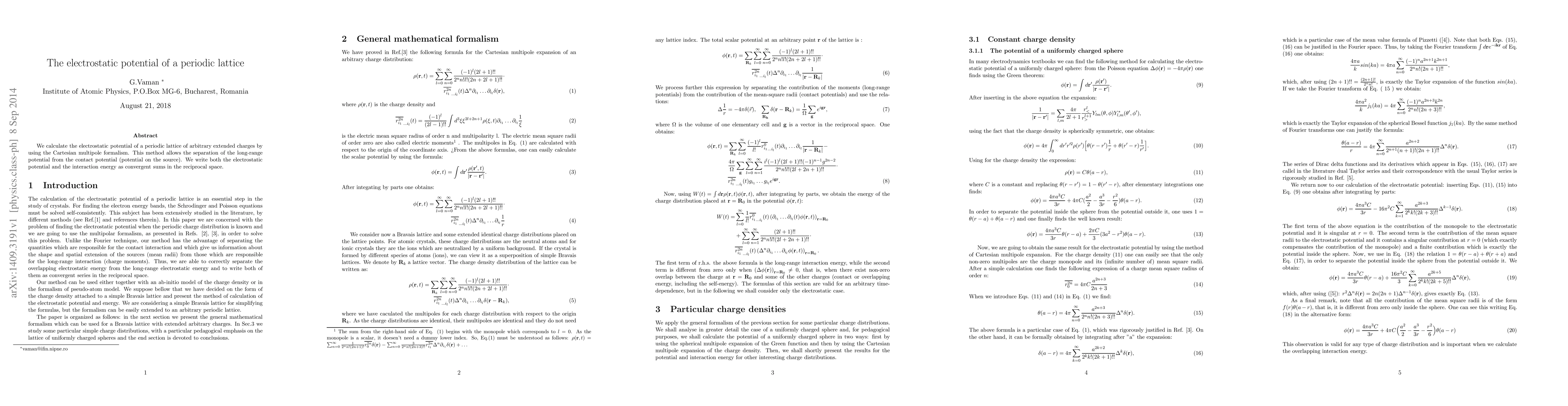 We calculate the electrostatic potential of a periodic lattice of arbitrary extended charges by using the Cartesian multipole formalism. This method allows the separation of the long-range potential from the contact potential (potential on the source). We write both the electrostatic potential and the interaction energy as convergent sums in the reciprocal space.
