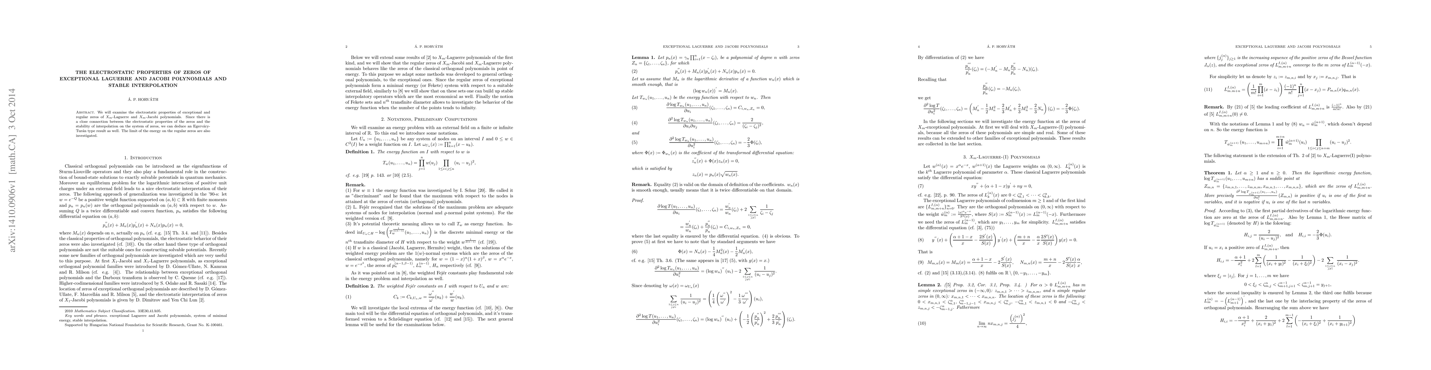 This paper investigates the electrostatic properties of zeros of exceptional and regular Laguerre and Jacobi polynomials, linking these properties to the stability of interpolation. It also explores an Egerváry-Turán type result and examines the limit of the energy on regular zeros.