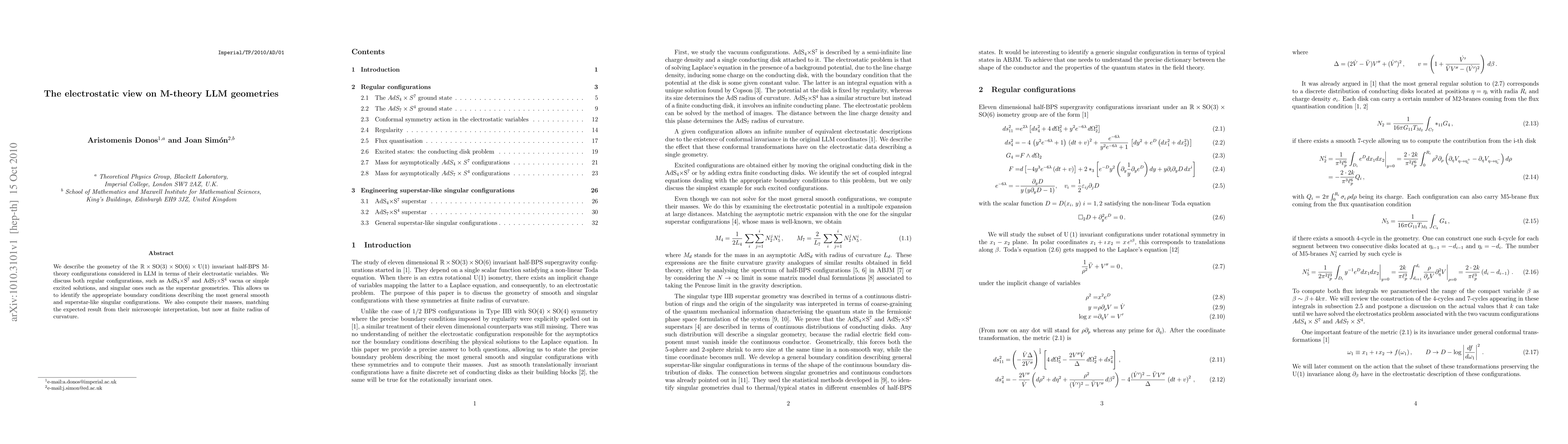We describe the geometry of the R x SO(3) x SO(6) x U(1) invariant half-BPS M-theory configurations considered in LLM in terms of their electrostatic variables. We discuss both regular configurations, such as AdS_4 x S^7 and AdS_7 x S^4 vacua or simple excited solutions, and singular ones such as the superstar geometries. This allows us to identify the appropriate boundary conditions describing the most general smooth and superstar-like singular configurations. We also compute their masses, matching the expected result from their microscopic interpretation, but now at finite radius of curvature.