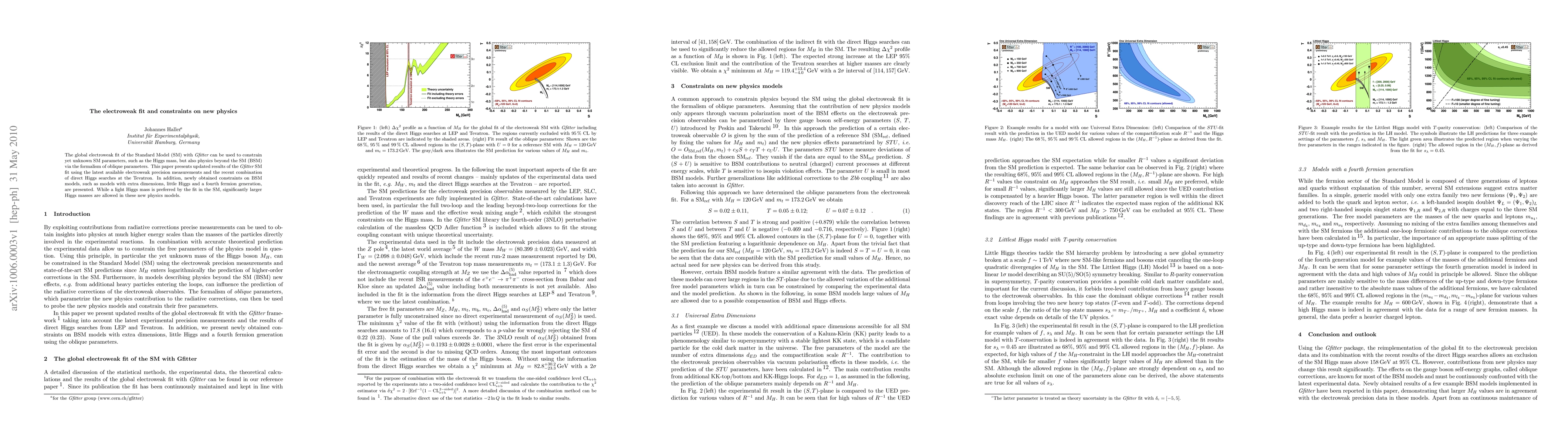 The global electroweak fit of the Standard Model (SM) with Gfitter can be used to constrain yet unknown SM parameters, such as the Higgs mass, but also physics beyond the SM (BSM) via the formalism of oblique parameters. This paper presents updated results of the Gfitter SM fit using the latest available electroweak precision measurements and the recent combination of direct Higgs searches at the Tevatron. In addition, newly obtained constraints on BSM models, such as models with extra dimensions, little Higgs and a fourth fermion generation, are presented. While a light Higgs mass is preferred by the fit in the SM, significantly larger Higgs masses are allowed in these new physics models.