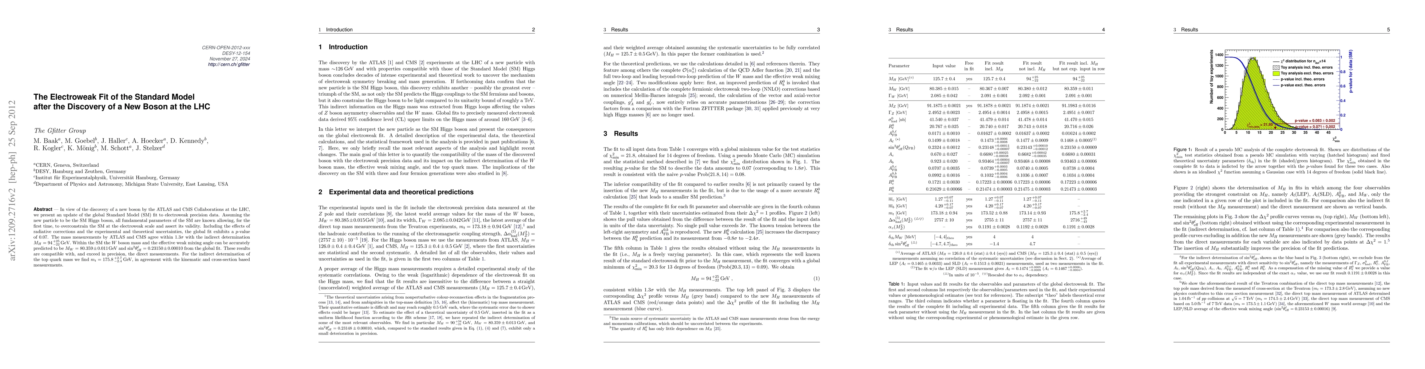 This paper updates the global Standard Model fit following the discovery of a new boson at the LHC, confirming it as the SM Higgs boson. The fit shows a p-value of 0.07, indicating strong consistency with the electroweak precision data, and predicts the W boson mass and effective weak mixing angle with high precision.