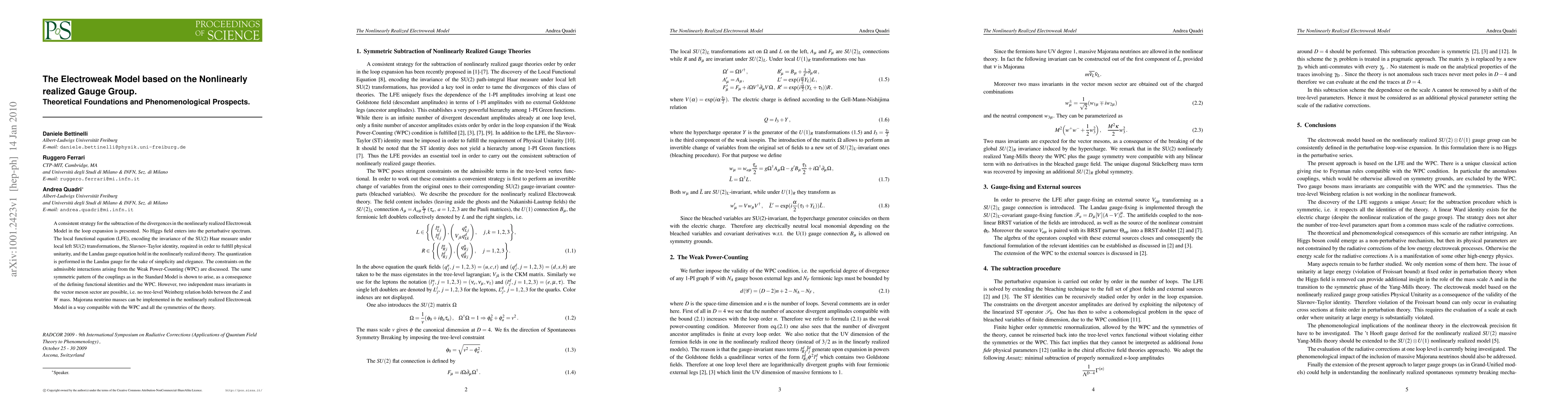 A consistent strategy for the subtraction of the divergences in the nonlinearly realized Electroweak Model in the loop expansion is presented. No Higgs field enters into the perturbative spectrum. The local functional equation (LFE), encoding the invariance of the SU(2) Haar measure under local left SU(2) transformations, the Slavnov-Taylor identity, required in order to fulfill physical unitarity, and the Landau gauge equation hold in the nonlinearly realized theory. The quantization is performed in the Landau gauge for the sake of simplicity and elegance. The constraints on the admissible interactions arising from the Weak Power-Counting (WPC) are discussed. The same symmetric pattern of the couplings as in the Standard Model is shown to arise, as a consequence of the defining functional identities and the WPC. However, two independent mass invariants in the vector meson sector are possible, i.e. no tree-level Weinberg relation holds between the Z and W mass. Majorana neutrino masses can be implemented in the nonlinearly realized Electroweak Model in a way compatible with the WPC and all the symmetries of the theory.