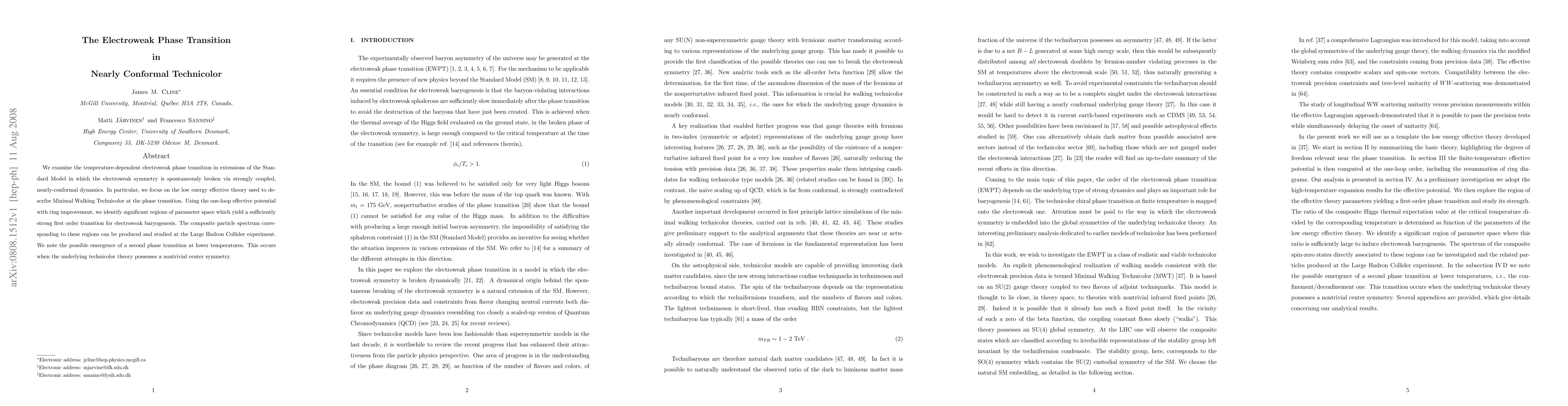 This paper explores the electroweak phase transition in nearly conformal Technicolor models, identifying parameter regions that allow for a strong first-order transition conducive to electroweak baryogenesis. It highlights the potential for studying the composite particle spectrum at the LHC and notes a possible second phase transition linked to nontrivial center symmetry.