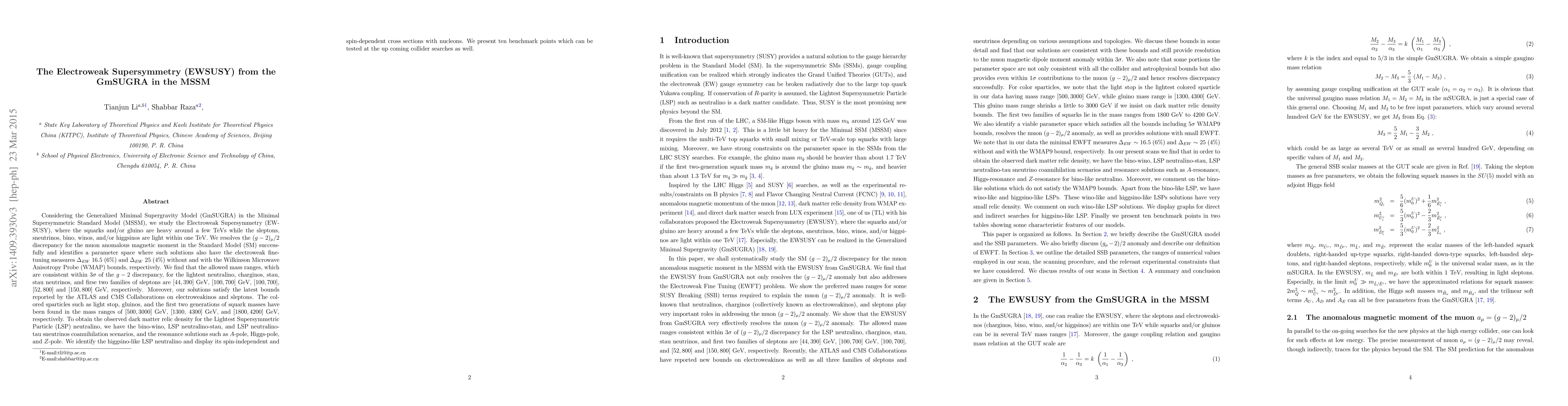 This paper explores Electroweak Supersymmetry (EWSUSY) within the Generalized Minimal Supergravity Model (GmSUGRA) in the Minimal Supersymmetric Standard Model (MSSM), resolving the $(g_{\mu}-2)/2$ discrepancy and identifying parameter spaces that satisfy electroweak fine-tuning measures. It presents mass ranges for various supersymmetric particles and benchmark points for future collider tests.