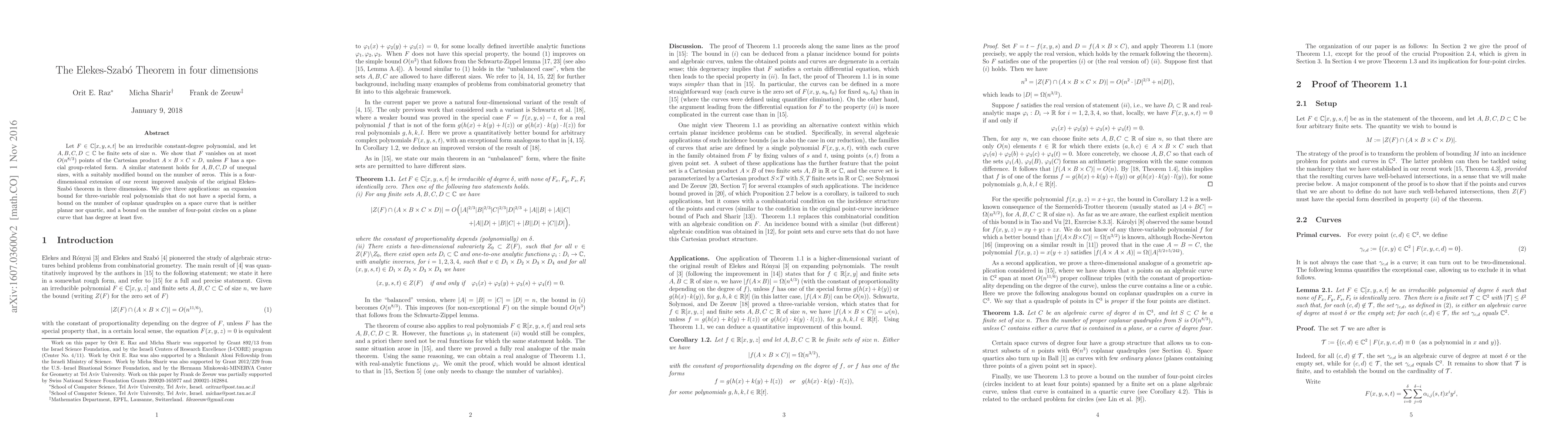 Let $F\in\mathbb{C}[x,y,s,t]$ be an irreducible constant-degree polynomial, and let $A,B,C,D\subset\mathbb{C}$ be finite sets of size $n$. We show that $F$ vanishes on at most $O(n^{8/3})$ points of the Cartesian product $A\times B\times C\times D$, unless $F$ has a special group-related form. A similar statement holds for $A,B,C,D$ of unequal sizes. This is a four-dimensional extension of our recent improved analysis of the original Elekes-Szab\'o theorem in three dimensions. We give three applications: an expansion bound for three-variable real polynomials that do not have a special form, a bound on the number of coplanar quadruples on a space curve that is neither planar nor quartic, and a bound on the number of four-point circles on a plane curve that has degree at least five.