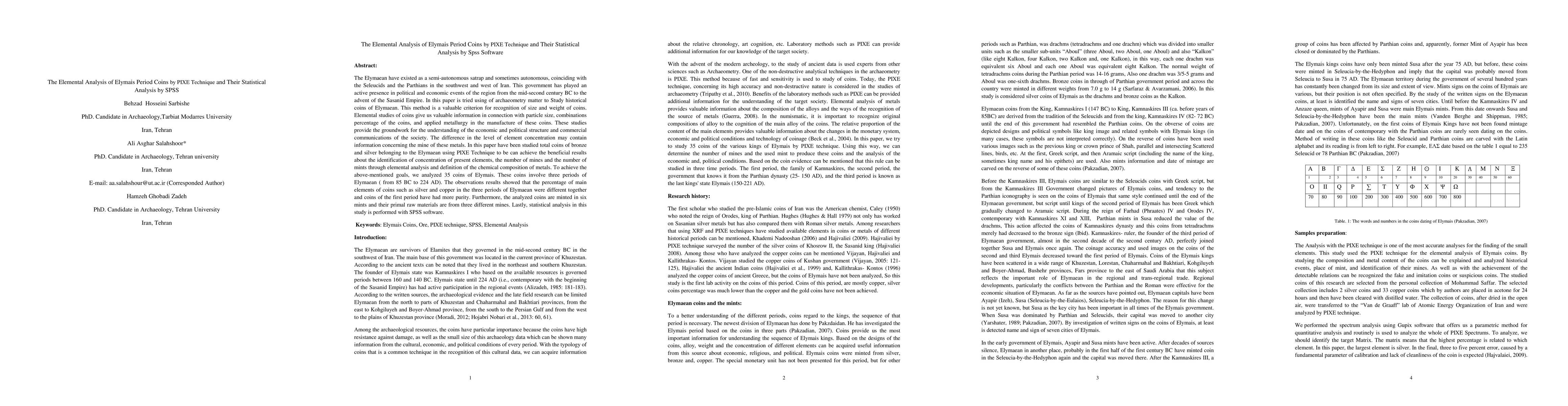 The Elymaean have existed as a semi-autonomous satrap and sometimes autonomous, coinciding with the Seleucids and the Parthians in the southwest and west of Iran. This government has played an active presence in political and economic events of the region from the mid-second century BC to the advent of the Sasanid Empire. In this paper is tried using of archaeometry matter to Study historical coins of Elymaean. This method is a valuable criterion for recognition of size and weight of coins. Elemental studies of coins give us valuable information in connection with particle size, combinations percentage of the coins, and applied metallurgy in the manufacture of these coins. These studies provide the groundwork for the understanding of the economic and political structure and commercial communications of the society. The difference in the level of element concentration may contain information concerning the mine of these metals. In this paper have been studied total coins of bronze and silver belonging to the Elymaean using PIXE Technique to be can achieve the beneficial results about the identification of concentration of present elements, the number of mines and the number of mints through elemental analysis and definition of the chemical composition of metals. To achieve the above-mentioned goals, we analyzed 35 coins of Elymais. These coins involve three periods of Elymaean ( from 85 BC to 224 AD). The observations results showed that the percentage of main elements of coins such as silver and copper in the three periods of Elymaean were different together and coins of the first period have had more purity. Furthermore, the analyzed coins are minted in six mints and their primal raw materials are from three different mines. Lastly, statistical analysis in this study is performed with SPSS software.