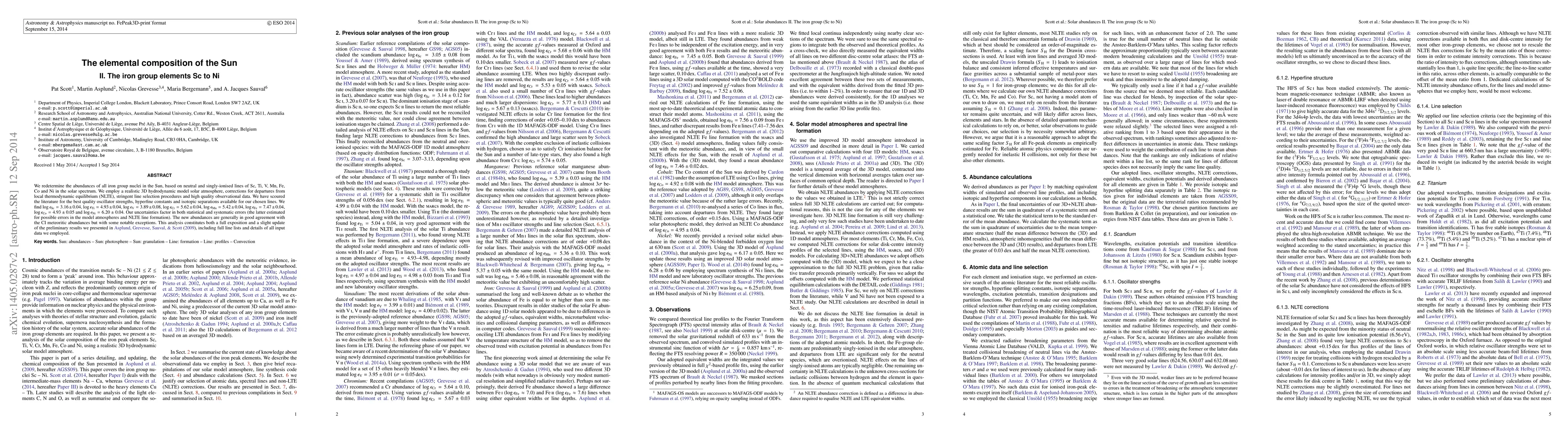 We redetermine the abundances of all iron group nuclei in the Sun, based on neutral and singly-ionised lines of Sc, Ti, V, Mn, Fe, Co and Ni in the solar spectrum. We employ a realistic 3D hydrodynamic model solar atmosphere, corrections for departures from local thermodynamic equilibrium (NLTE), stringent line selection procedures and high quality observational data. We have scoured the literature for the best quality oscillator strengths, hyperfine constants and isotopic separations available for our chosen lines. We find $\log \epsilon_\mathrm{Sc}=3.16\pm0.04$, $\log \epsilon_\mathrm{Ti}=4.93\pm0.04$, $\log \epsilon_\mathrm{V}=3.89\pm0.08$, $\log \epsilon_\mathrm{Cr}=5.62\pm0.04$, $\log \epsilon_\mathrm{Mn}=5.42\pm0.04$, $\log \epsilon_\mathrm{Fe}=7.47\pm0.04$, $\log \epsilon_\mathrm{Co}=4.93\pm0.05$ and $\log \epsilon_\mathrm{Ni}=6.20\pm0.04$. Our uncertainties factor in both statistical and systematic errors (the latter estimated for possible errors in the model atmospheres and NLTE line formation). The new abundances are generally in good agreement with the CI meteoritic abundances but with some notable exceptions. This analysis constitutes both a full exposition and a slight update of the preliminary results we presented in Asplund, Grevesse, Sauval & Scott (arXiv:0909.0948), including full line lists and details of all input data we employed.