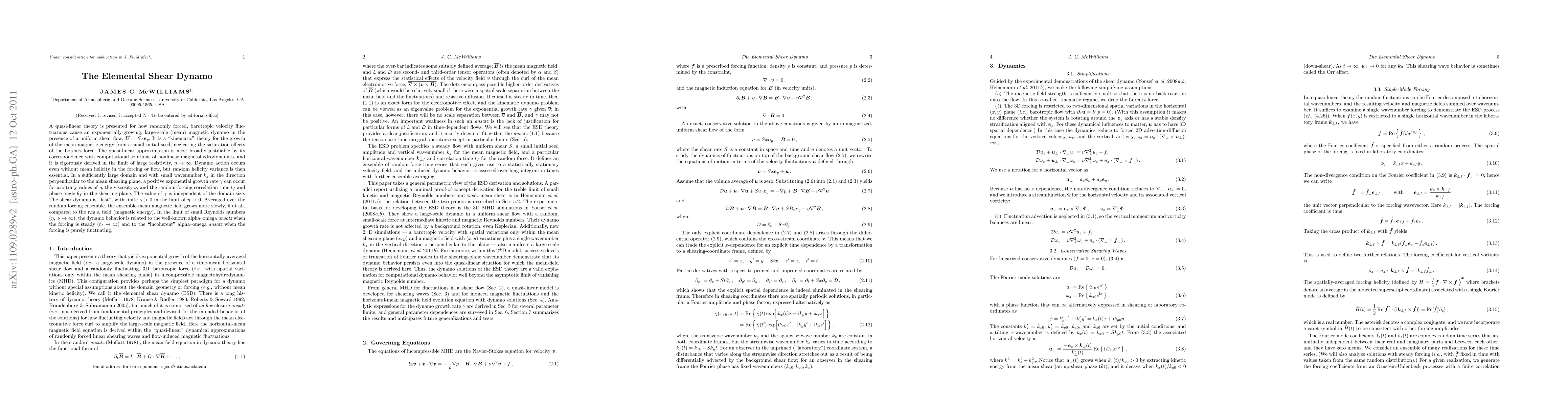A quasi-linear theory is presented for how randomly forced, barotropic velocity fluctuations cause an exponentially-growing, large-scale (mean) magnetic dynamo in the presence of a uniform shear flow, $\vec{U} = S x \vec{e}_y$. It is a "kinematic" theory for the growth of the mean magnetic energy from a small initial seed, neglecting the saturation effects of the Lorentz force. The quasi-linear approximation is most broadly justifiable by its correspondence with computational solutions of nonlinear magneto-hydrodynamics, and it is rigorously derived in the limit of large resistivity, $\eta \rightarrow \infty$. Dynamo action occurs even without mean helicity in the forcing or flow, but random helicity variance is then essential. In a sufficiently large domain and with small wavenumber $k_z$ in the direction perpendicular to the mean shearing plane, a positive exponential growth rate $\gamma$ can occur for arbitrary values of $\eta$, the viscosity $\nu$, and the random-forcing correlation time $t_f$ and phase angle $\theta_f$ in the shearing plane. The value of $\gamma$ is independent of the domain size. The shear dynamo is "fast", with finite $\gamma > 0$ in the limit of $\eta \rightarrow 0$. Averaged over the random forcing ensemble, the mean magnetic field grows more slowly, if at all, compared to the r.m.s. field (or magnetic energy). In the limit of small Reynolds numbers ($\eta, \ \nu \rightarrow \infty$), the dynamo behavior is related to the well-known alpha--omega {\it ansatz} when the forcing is steady ($t_f \rightarrow \infty$) and to the "incoherent" alpha--omega {\it ansatz} when the forcing is purely fluctuating.