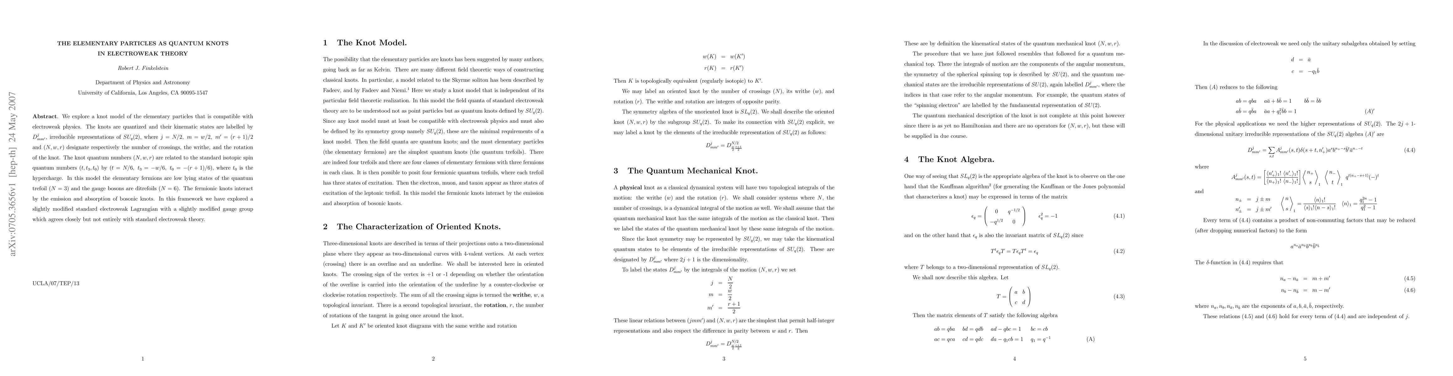 We explore a knot model of the elementary particles that is compatible with electroweak physics. The knots are quantized and their kinematic states are labelled by $D^j_{mm'}$, irreducible representations of $SU_q(2)$, where j = N/2, m = w/2, m' = (r+1)/2 and (N,w,r) designate respectively the number of crossings, the writhe, and the rotation of the knot. The knot quantum numbers (N,w,r) are related to the standard isotopic spin quantum numbers $(t,t_3,t_0)$ by $(t=N/6,t_3=-w/6,t_0=-(r+1)/6)$, where $t_0$ is the hypercharge. In this model the elementary fermions are low lying states of the quantum trefoil (N=3) and the gauge bosons are ditrefoils (N=6). The fermionic knots interact by the emission and absorption of bosonic knots. In this framework we have explored a slightly modified standard electroweak Lagrangian with a slightly modified gauge group which agrees closely but not entirely with standard electroweak theory.
