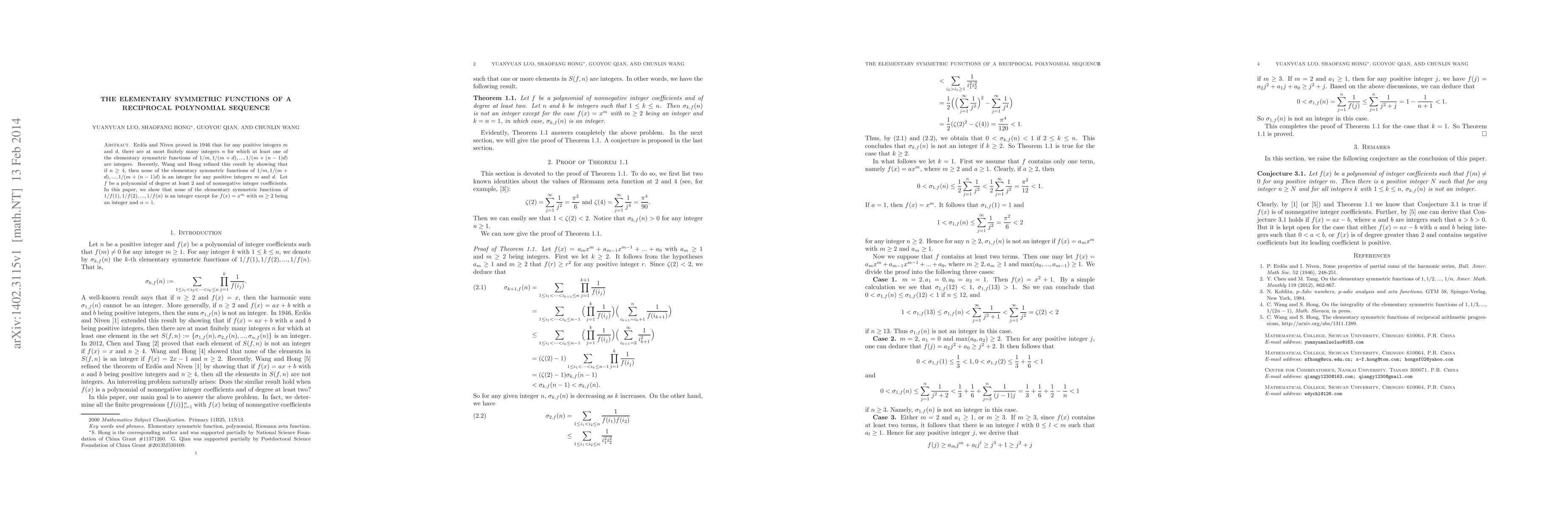 Erd\"{o}s and Niven proved in 1946 that for any positive integers $m$ and $d$, there are at most finitely many integers $n$ for which at least one of the elementary symmetric functions of $1/m, 1/(m+d), ..., 1/(m+(n-1)d)$ are integers. Recently, Wang and Hong refined this result by showing that if $n\geq 4$, then none of the elementary symmetric functions of $1/m, 1/(m+d), ..., 1/(m+(n-1)d)$ is an integer for any positive integers $m$ and $d$. Let $f$ be a polynomial of degree at least $2$ and of nonnegative integer coefficients. In this paper, we show that none of the elementary symmetric functions of $1/f(1), 1/f(2), ..., 1/f(n)$ is an integer except for $f(x)=x^{m}$ with $m\geq2$ being an integer and $n=1$.