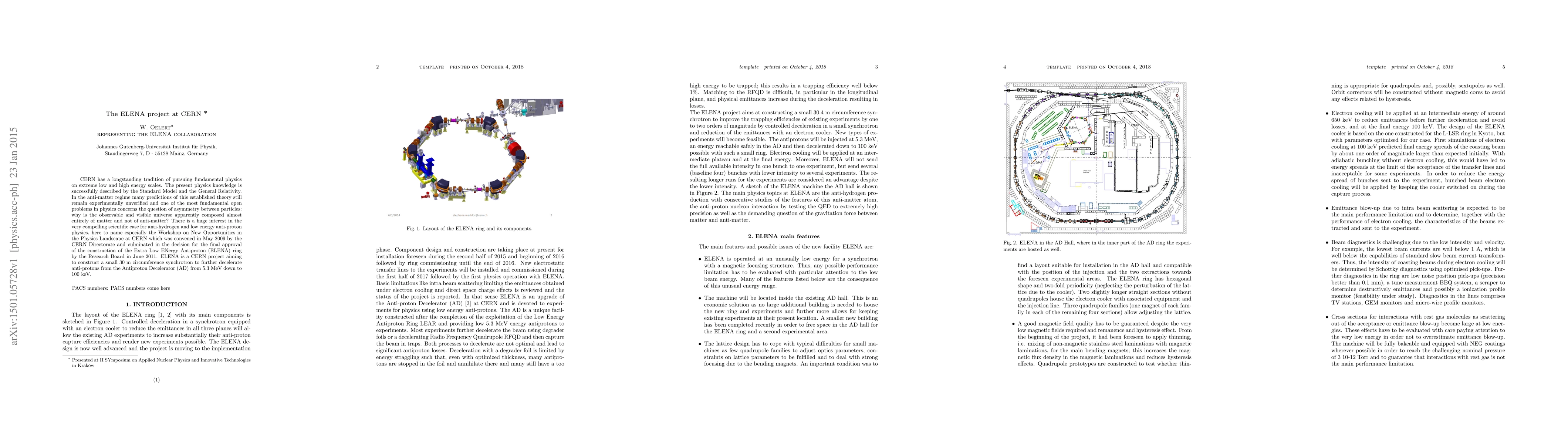 The ELENA project at CERN aims to construct a synchrotron to decelerate anti-protons to study the asymmetry between matter and anti-matter, addressing fundamental questions in physics. The project follows the Workshop on New Opportunities in the Physics Landscape, leading to the approval of the ELENA ring in 2011.