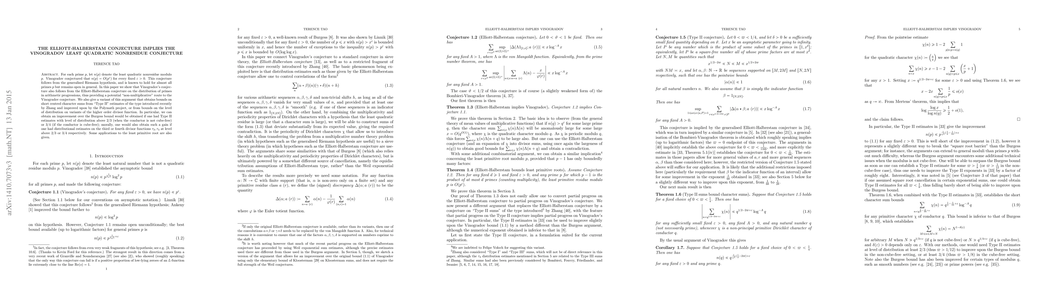 The paper shows that the Elliott-Halberstam conjecture implies Vinogradov's least quadratic nonresidue conjecture, providing a potential route to solving this open problem.