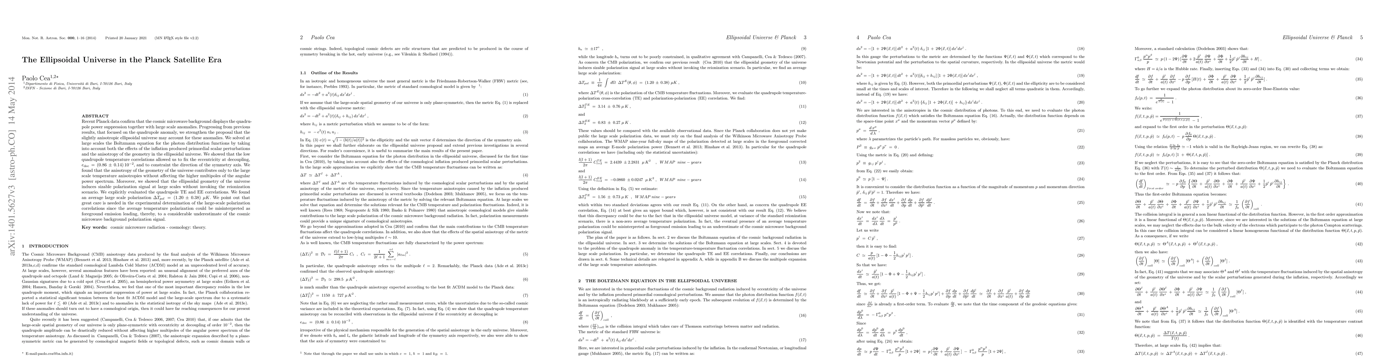 Recent Planck data reveal anomalies in the cosmic microwave background, suggesting an ellipsoidal universe geometry. The study shows that the low quadrupole temperature correlations allow for fixing the eccentricity at decoupling and constraining the symmetry axis direction, contributing to large-scale temperature anisotropies without affecting higher multipoles.