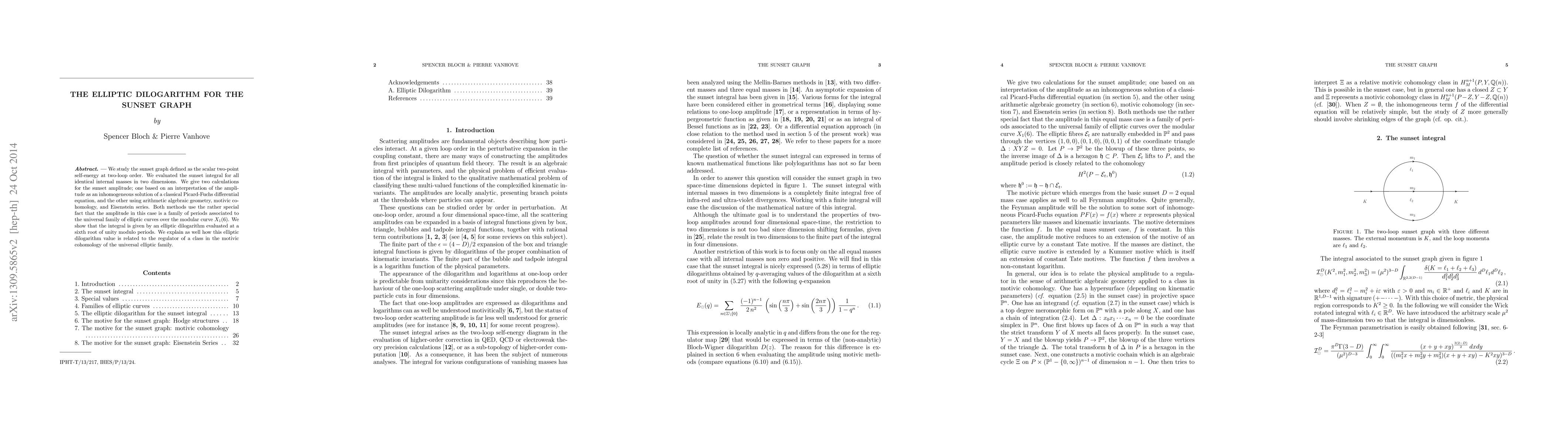 This paper evaluates the sunset graph integral at two-loop order, employing both classical Picard-Fuchs differential equations and arithmetic algebraic geometry to show it corresponds to an elliptic dilogarithm evaluated at a sixth root of unity, linked to the regulator of a class in motivic cohomology.