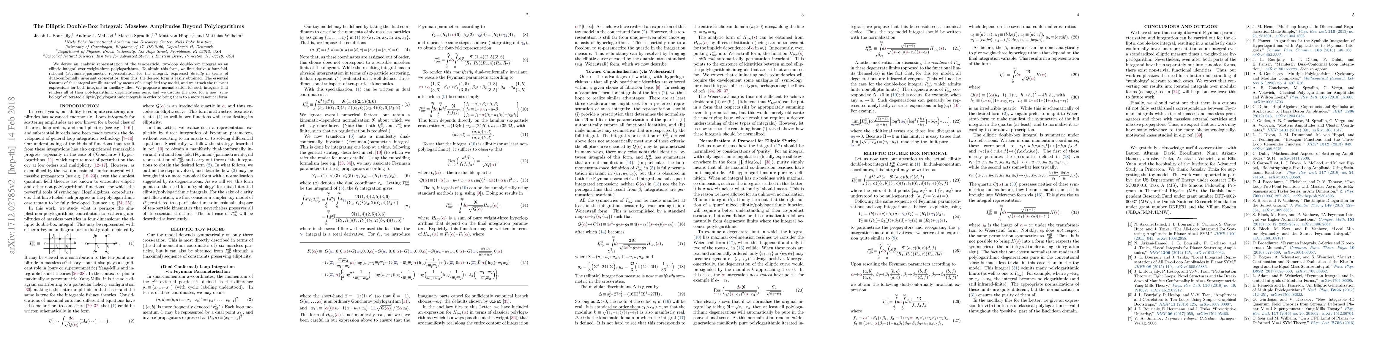 This paper derives an analytic representation of the ten-particle, two-loop double-box integral as an elliptic integral over weight-three polylogarithms, proposing a new normalization to render all polylogarithmic degenerations pure. It also discusses the need for a new 'symbology' for iterated elliptic/polylogarithmic integrals.