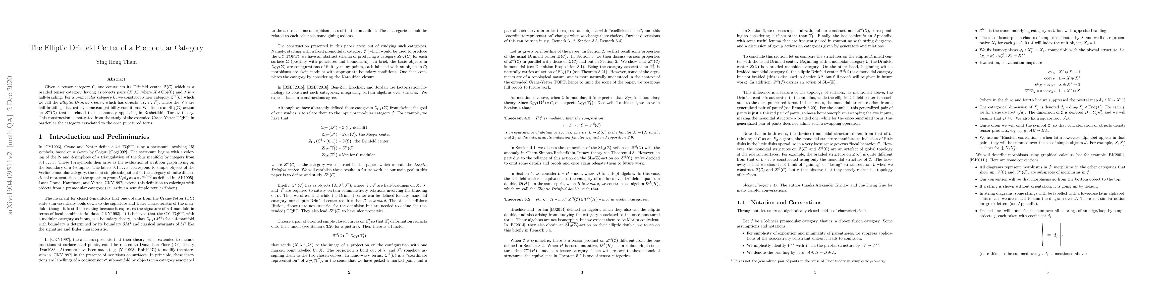 Summary: This paper constructs the Elliptic Drinfeld Center Zel(C) of a premodular category C, characterized by objects (X, λ1, λ2) with specific half-braiding compatibility conditions. It also introduces an SL2(Z)-action on Zel(C) tied to anomalies in Reshetikhin-Turaev theory, motivated by the extended Crane-Yetter topological quantum field theory.