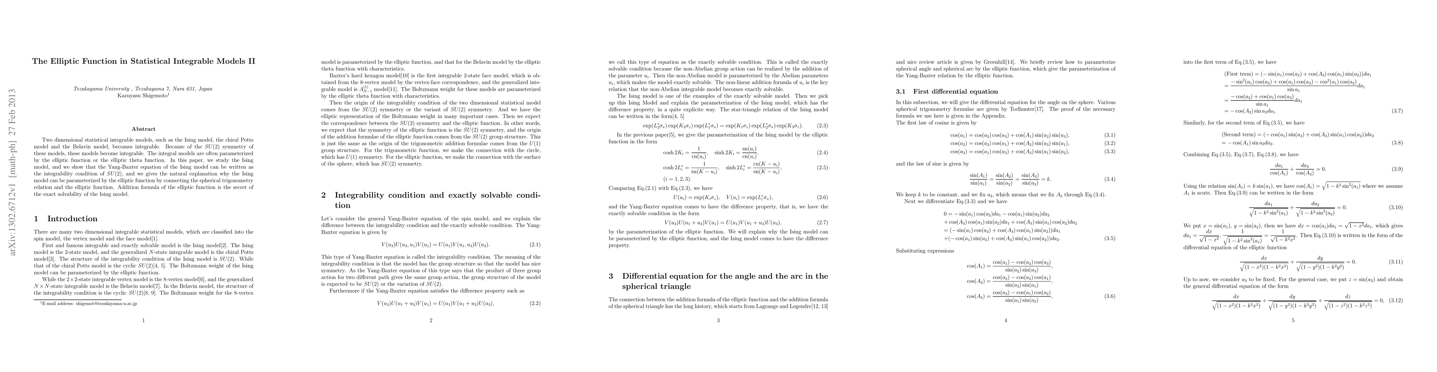 The paper shows how the Ising model can be parameterized by an elliptic function due to its SU(2) symmetry, leading to integrability in two-dimensional statistical models.