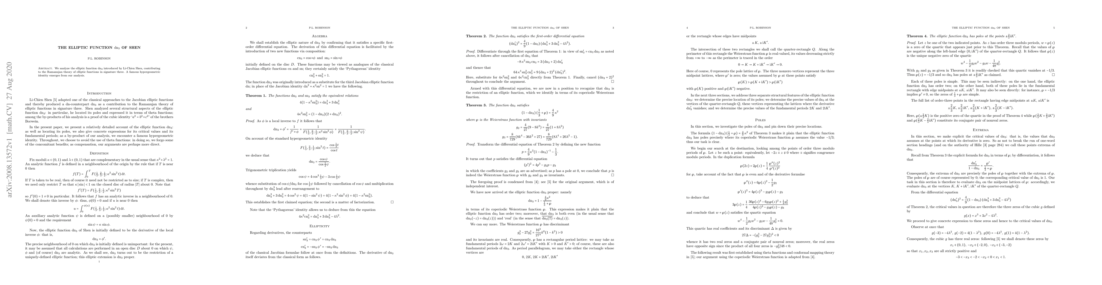 We analyze the elliptic function ${\rm dn}_3$ introduced by Li-Chien Shen, contributing to the Ramanujan theory of elliptic functions in signature three. A famous hypergeometric identity emerges from our analysis.