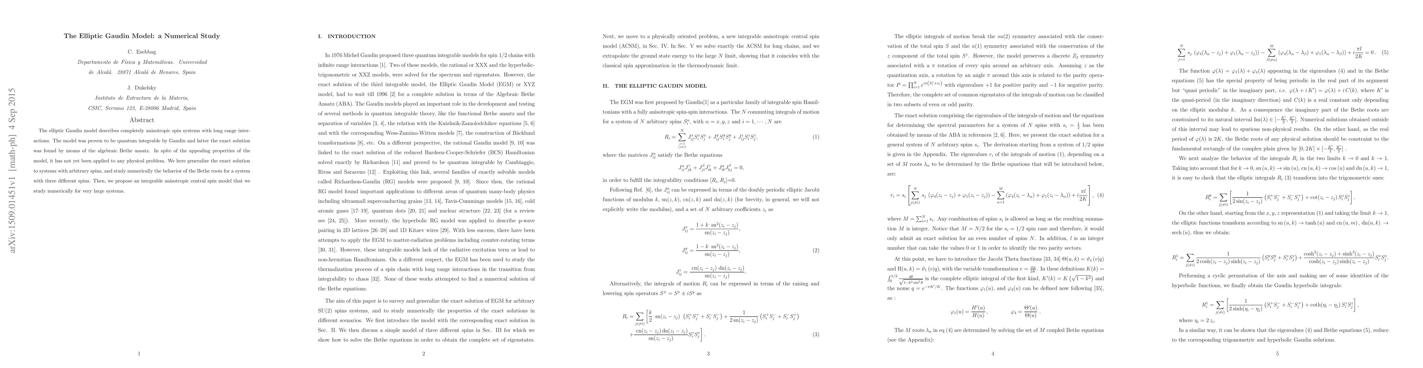 The elliptic Gaudin model describes completely anisotropic spin systems with long range interactions. The model was proven to be quantum integrable by Gaudin and latter the exact solution was found by means of the algebraic Bethe ansatz. In spite of the appealing properties of the model, it has not yet been applied to any physical problem. We here generalize the exact solution to systems with arbitrary spins, and study numerically the behavior of the Bethe roots for a system with three different spins. Then, we propose an integrable anisotropic central spin model that we study numerically for very large systems.