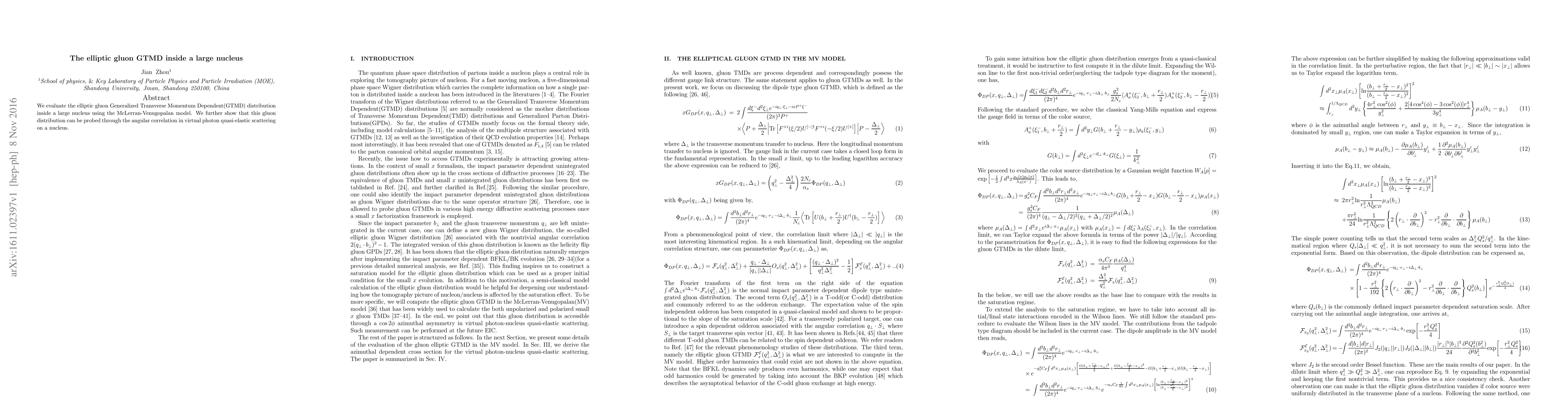 Summary: The paper evaluates the elliptic gluon Generalized Transverse Momentum Dependent (GTMD) distribution within a large nucleus using the McLerran-Venugopalan model and demonstrates its potential probing via angular correlations in virtual photon quasi-elastic scattering.