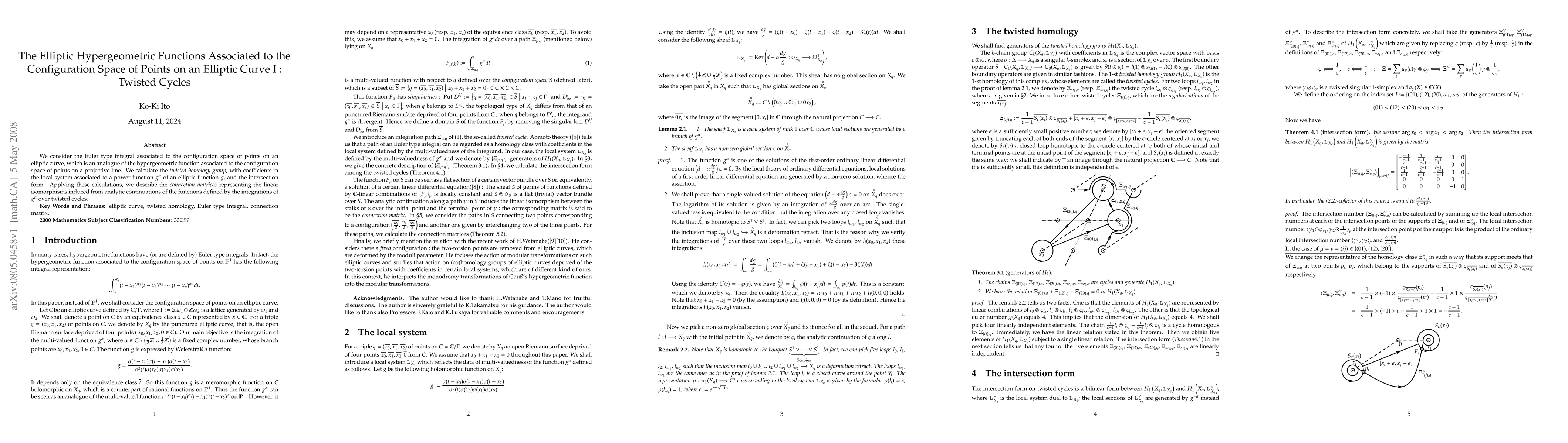 This paper investigates the Euler type integral related to the configuration space of points on an elliptic curve, analogous to hypergeometric functions on a projective line. It calculates the twisted homology group and describes connection matrices for linear isomorphisms induced by analytic continuations of power functions integrated over twisted cycles.
