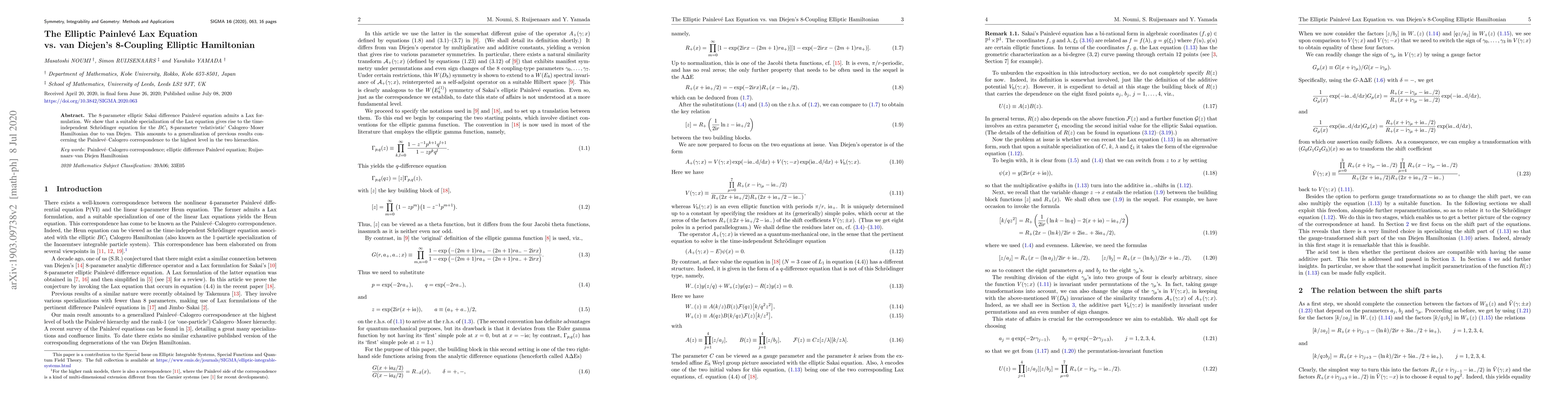Researchers show that a specific Lax equation formulation leads to the time-independent Schr"odinger equation for van Diejen's 8-Coupling elliptic Hamiltonian, generalizing previous results on the Painlevé-Calogero correspondence.