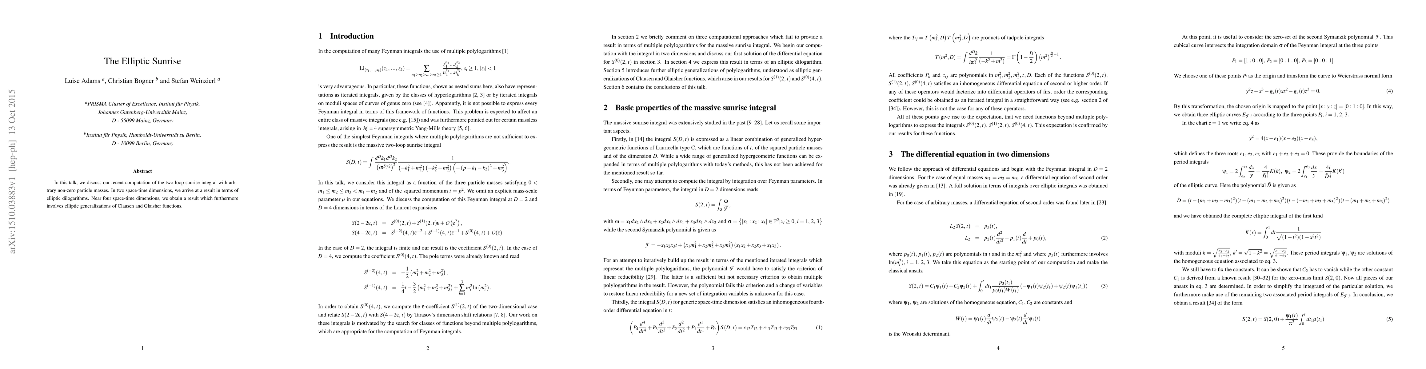 In this talk, we discuss our recent computation of the two-loop sunrise integral with arbitrary non-zero particle masses. In two space-time dimensions, we arrive at a result in terms of elliptic dilogarithms. Near four space-time dimensions, we obtain a result which furthermore involves elliptic generalizations of Clausen and Glaisher functions.
