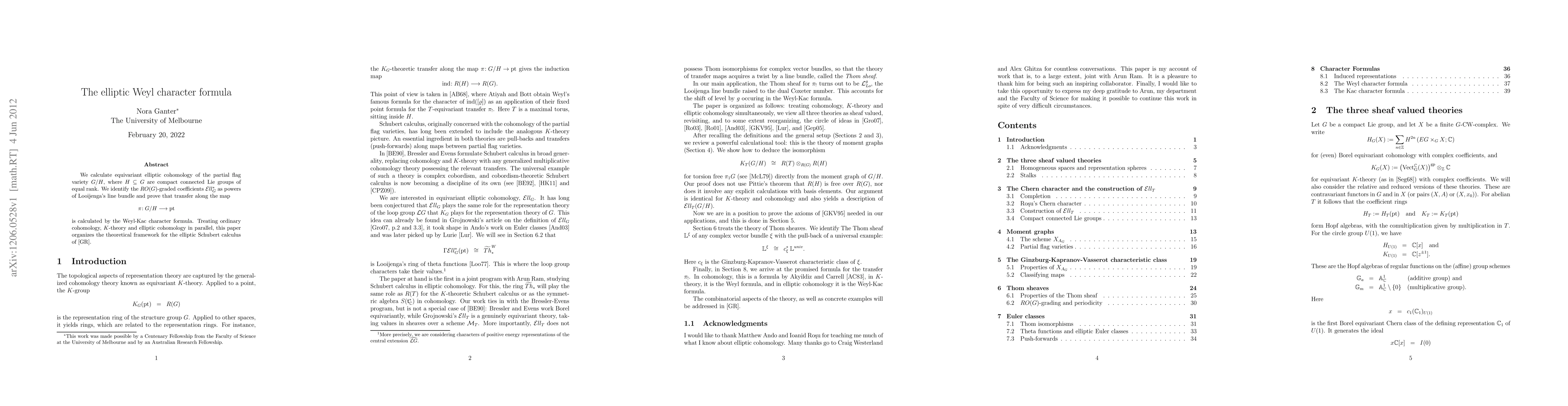This paper calculates the equivariant elliptic cohomology of the partial flag variety G/H for compact connected Lie groups of equal rank, identifying the RO(G)-graded coefficients Ell_G^* as powers of Looijenga's line bundle and proving the Weyl-Kac character formula for transfer along the map π: G/H → pt. It lays the theoretical groundwork for the elliptic Schubert calculus.
