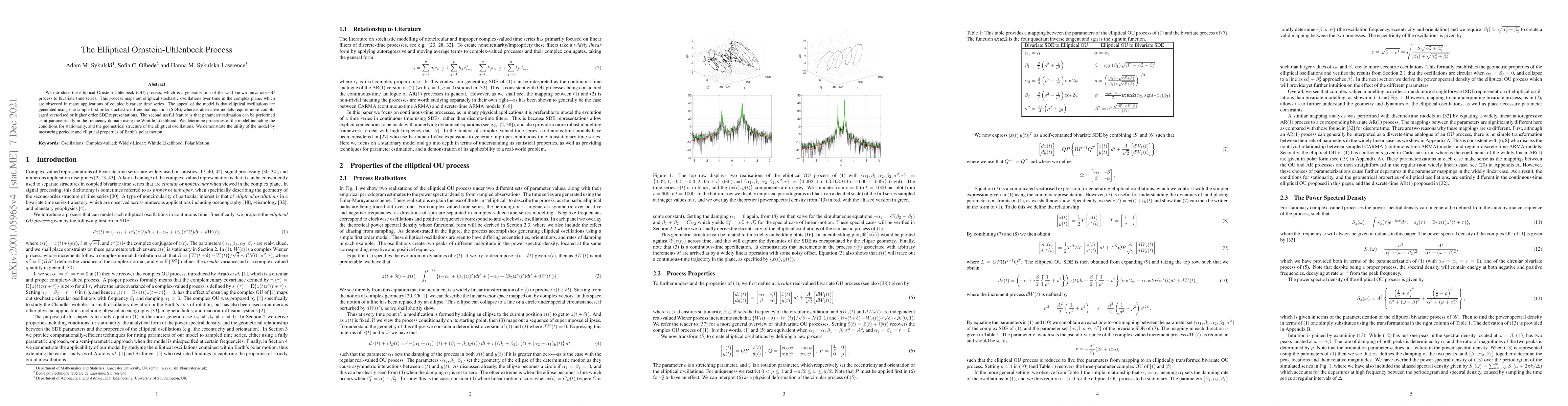 We introduce the elliptical Ornstein-Uhlenbeck (OU) process, which is a generalisation of the well-known univariate OU process to bivariate time series. This process maps out elliptical stochastic oscillations over time in the complex plane, which are observed in many applications of coupled bivariate time series. The appeal of the model is that elliptical oscillations are generated using one simple first order stochastic differential equation (SDE), whereas alternative models require more complicated vectorised or higher order SDE representations. The second useful feature is that parameter estimation can be performed semi-parametrically in the frequency domain using the Whittle Likelihood. We determine properties of the model including the conditions for stationarity, and the geometrical structure of the elliptical oscillations. We demonstrate the utility of the model by measuring periodic and elliptical properties of Earth's polar motion.