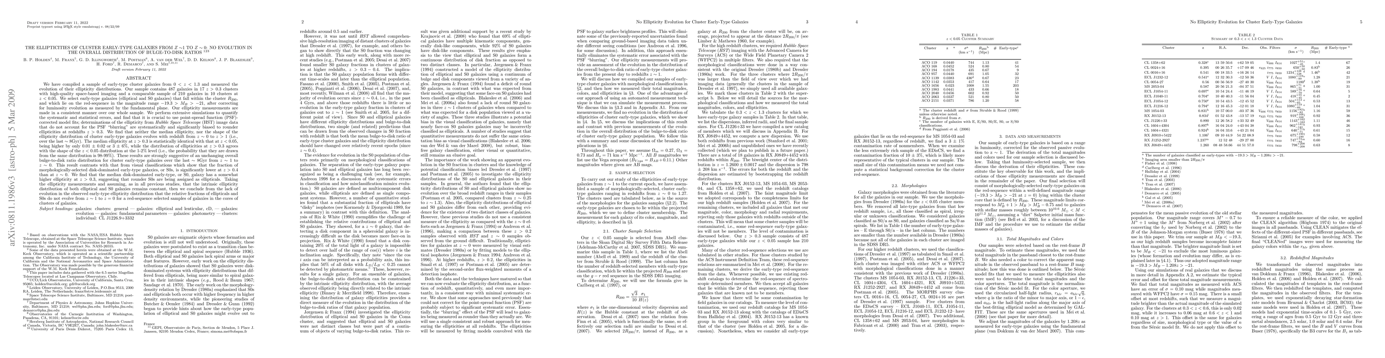This paper finds no evolution in the ellipticity distribution of early-type cluster galaxies from z~1 to z~0, indicating a stable overall bulge-to-disk ratio over the last ~8 billion years. The study contrasts with visual classifications suggesting a lower fraction of S0 galaxies at higher redshifts.
