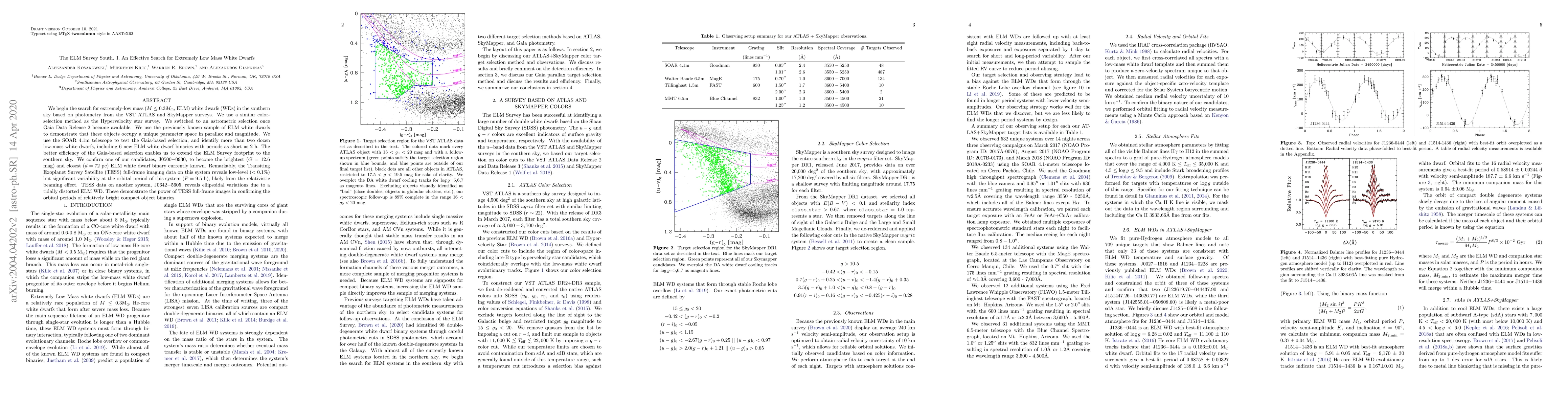 We begin the search for extremely-low mass ($M\leq0.3M_{\odot}$, ELM) white dwarfs (WDs) in the southern sky based on photometry from the VST ATLAS and SkyMapper surveys. We use a similar color-selection method as the Hypervelocity star survey. We switched to an astrometric selection once Gaia Data Release 2 became available. We use the previously known sample of ELM white dwarfs to demonstrate that these objects occupy a unique parameter space in parallax and magnitude. We use the SOAR 4.1m telescope to test the Gaia-based selection, and identify more than two dozen low-mass white dwarfs, including 6 new ELM white dwarf binaries with periods as short as 2 h. The better efficiency of the Gaia-based selection enables us to extend the ELM Survey footprint to the southern sky. We confirm one of our candidates, J0500$-$0930, to become the brightest ($G=12.6$ mag) and closest ($d=72$ pc) ELM white dwarf binary currently known. Remarkably, the Transiting Exoplanet Survey Satellite (TESS) full-frame imaging data on this system reveals low-level ($<0.1$%) but significant variability at the orbital period of this system ($P=9.5$ h), likely from the relativistic beaming effect. TESS data on another system, J0642$-$5605, reveals ellipsoidal variations due to a tidally distorted ELM WD. These demonstrate the power of TESS full-frame images in confirming the orbital periods of relatively bright compact object binaries.