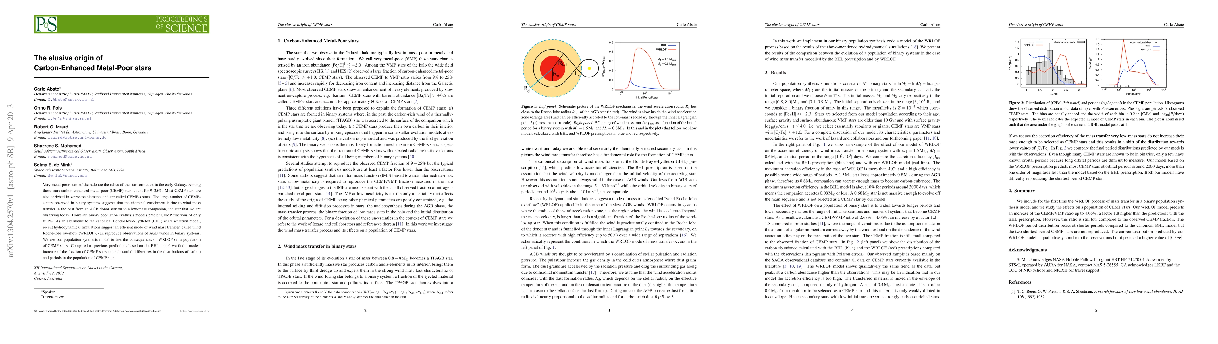 This paper investigates the origin of Carbon-Enhanced Metal-Poor (CEMP) stars, finding that wind Roche-lobe overflow (WRLOF) in binary systems can better explain their abundance compared to the Bondi-Hoyle-Lyttleton model, resulting in higher CEMP fractions and different carbon and period distributions.