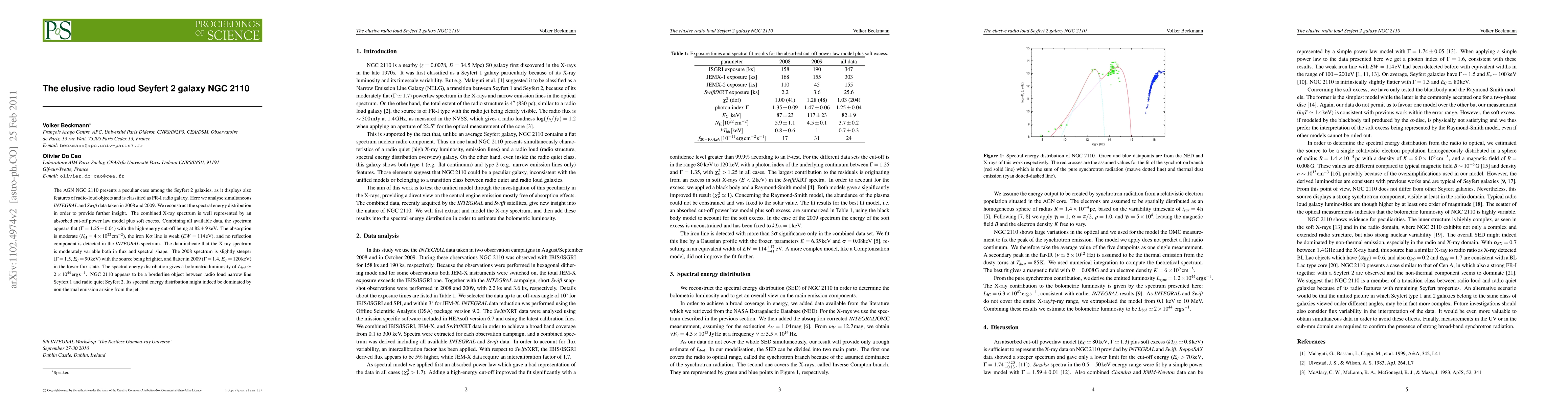 The AGN NGC 2110 exhibits features of both radio-loud objects and Seyfert 2 galaxies, with a flat X-ray spectrum and moderate intrinsic absorption. The spectral energy distribution suggests non-thermal emission from the jet, indicating it may be a borderline object between radio loud narrow line Seyfert 1 and radio quiet Seyfert 2.
